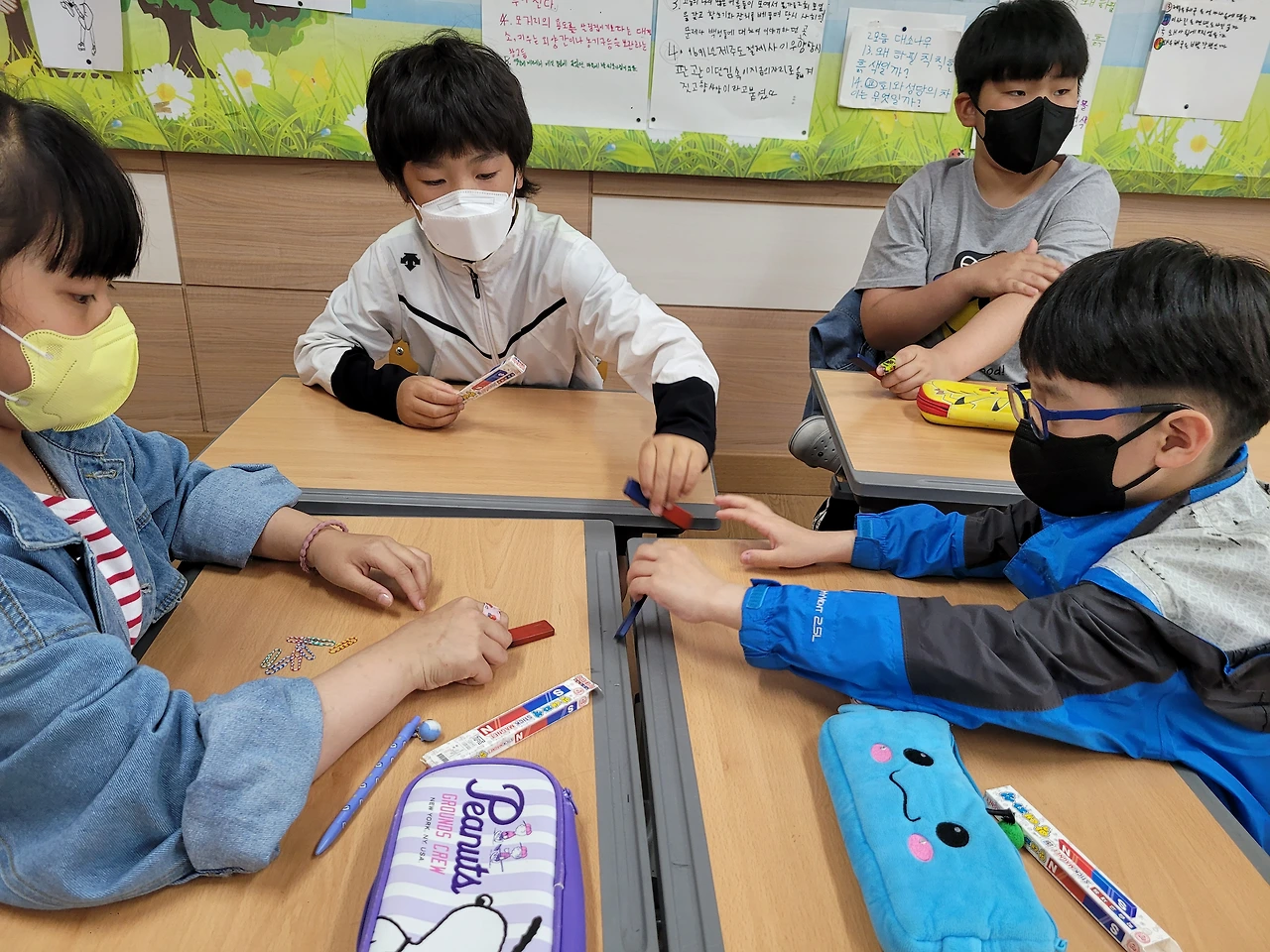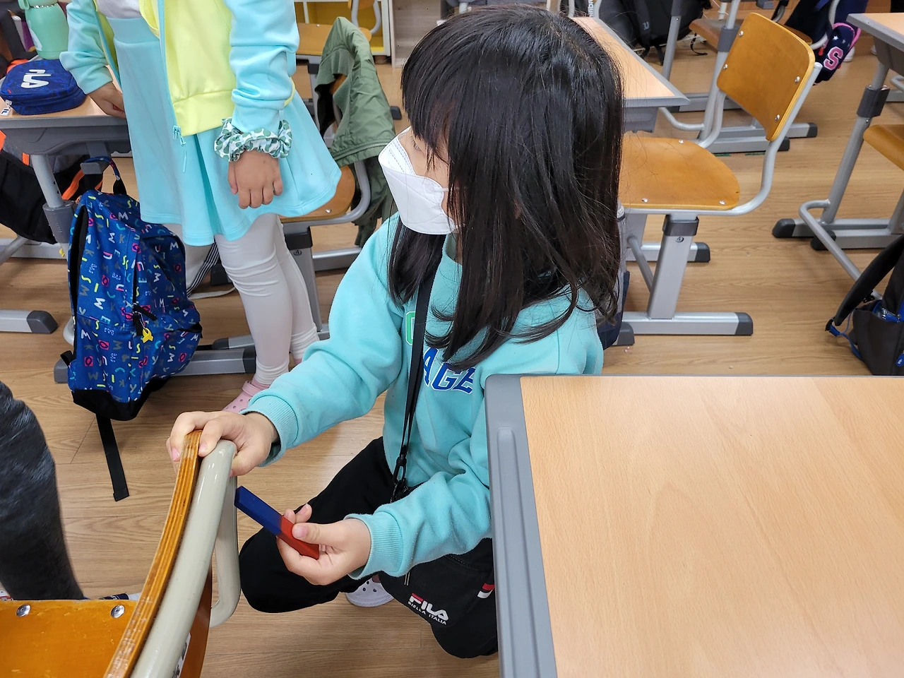 이번에는 아이들에게 막대자석을 모두 나눠주고, 이 중에는 가짜 자석도 섞여 있다고 이야기했습니다. 찾아보라고 했습니다. 아이들은 교실 여기저기에 자석을 붙였다 떼었다 하면서 내 자석이 진짜인지 가짜인지 찾아보았습니다.