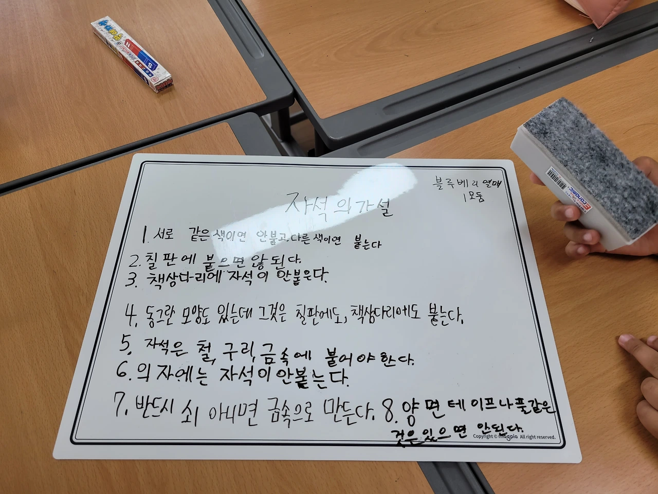 "자 칠판에 붙고 안 붙고 가 자석이 되는 조건이 될까?"