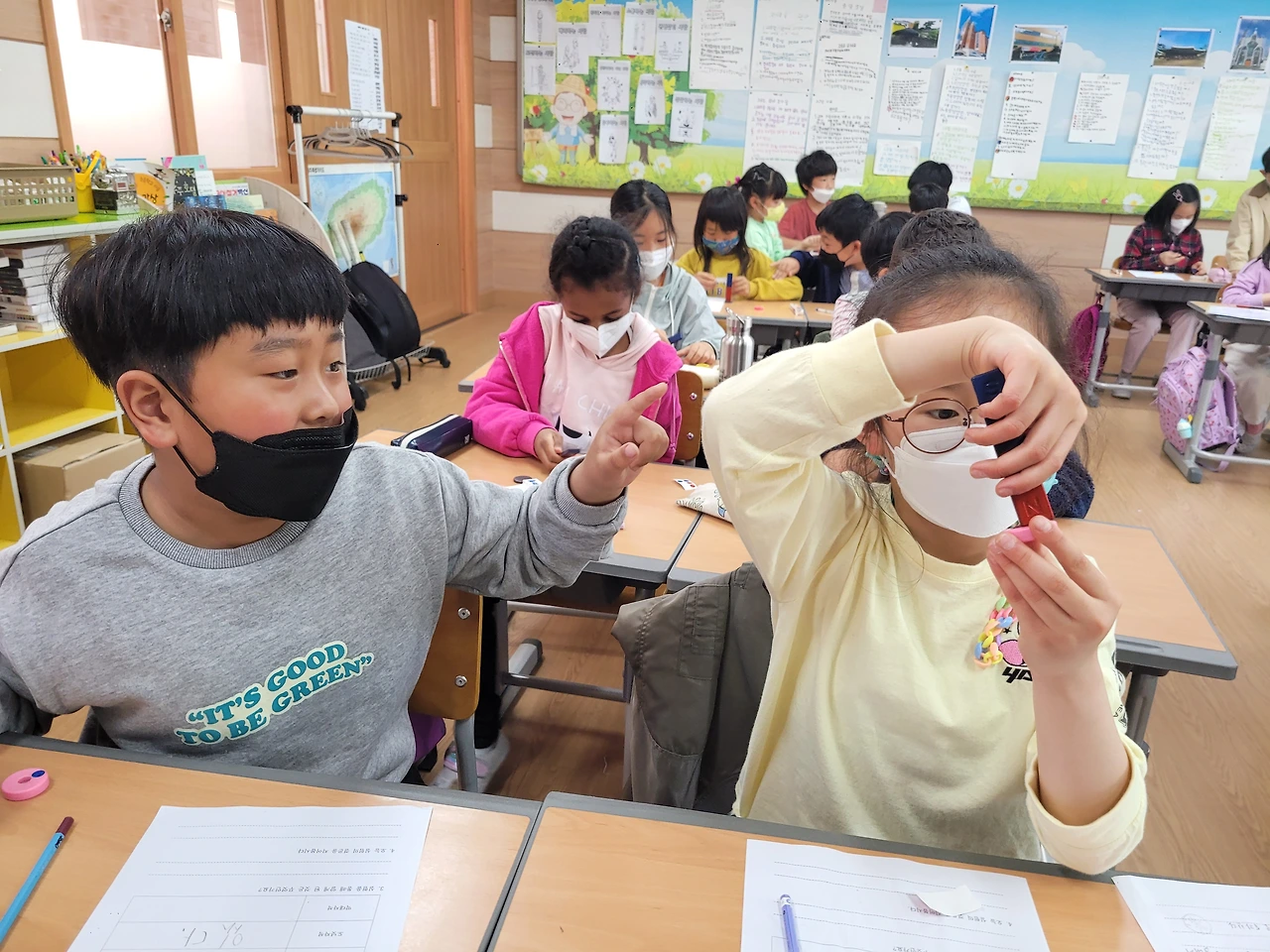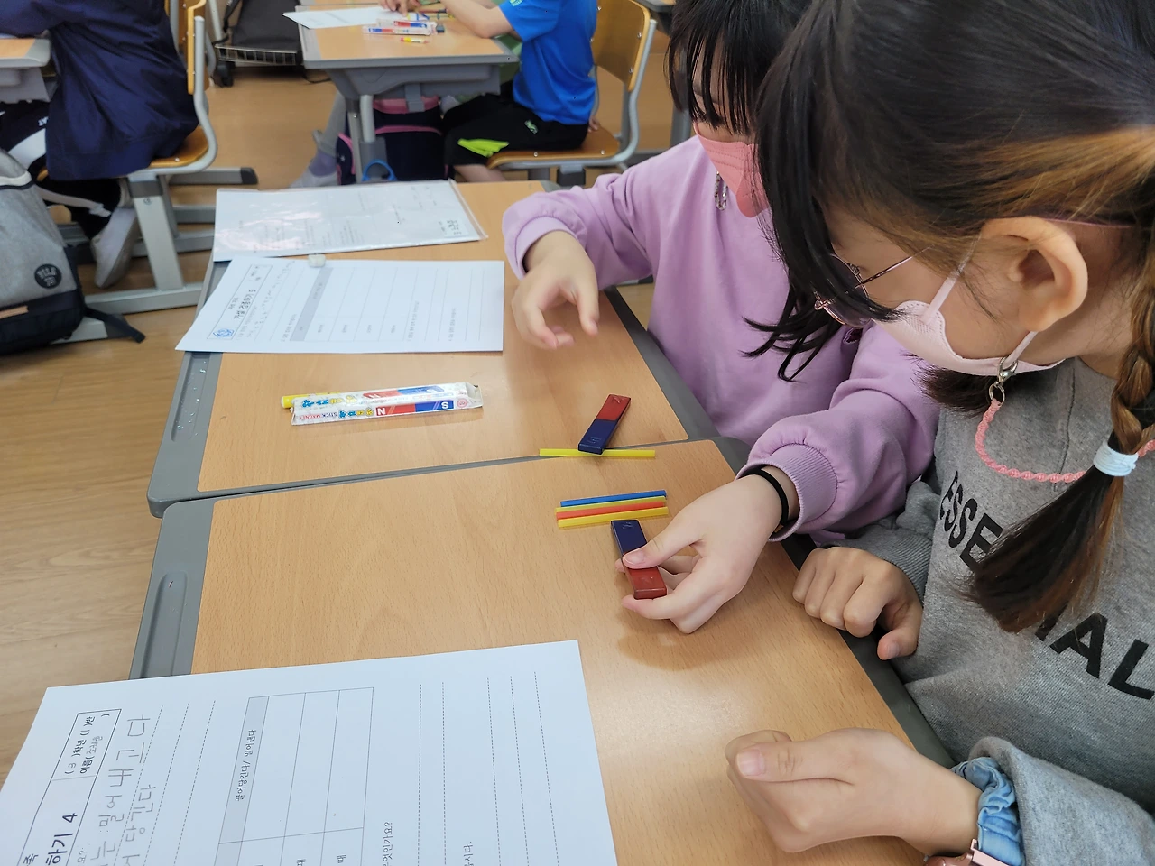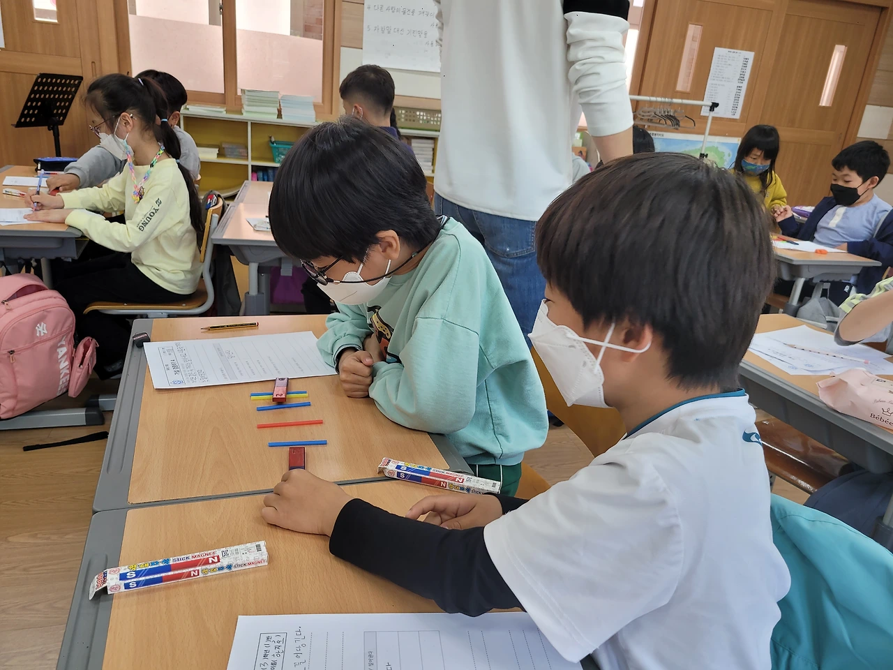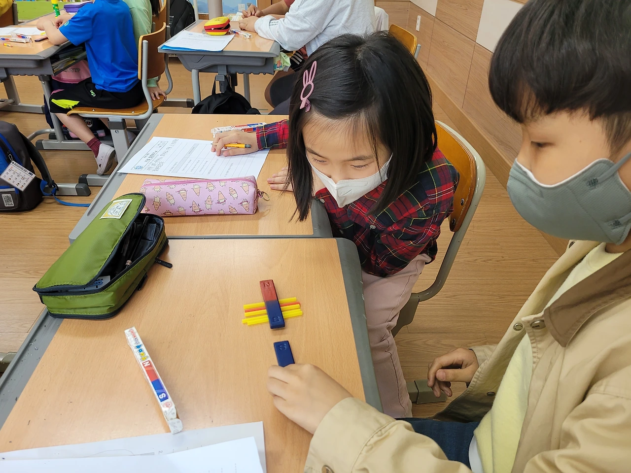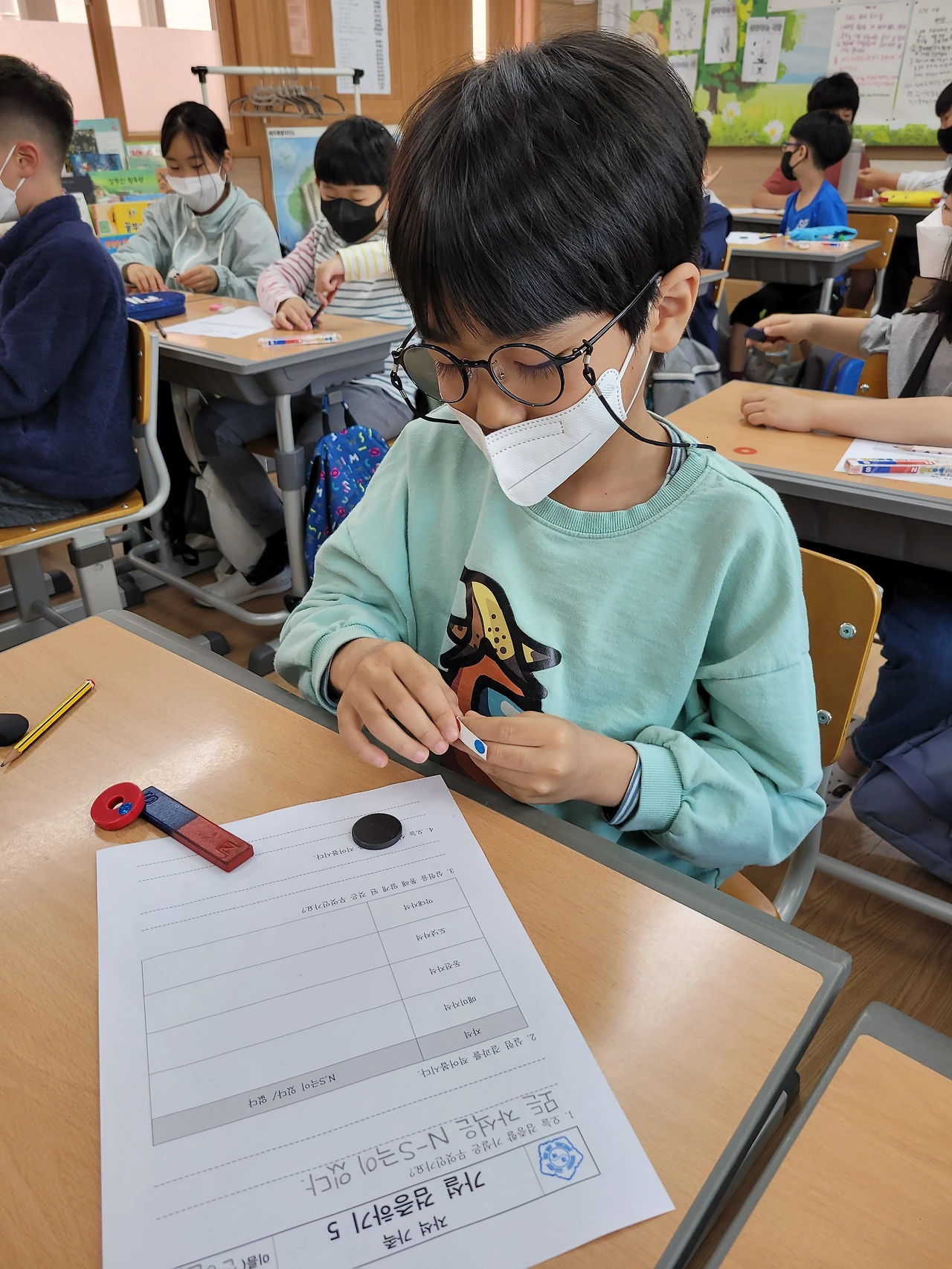 교실의 정적을 깨고 한 학생이 말했습니다. "자석을 장난감 자동차에 붙이고 다른 자석으로 같은 극을 밀어 봐요"