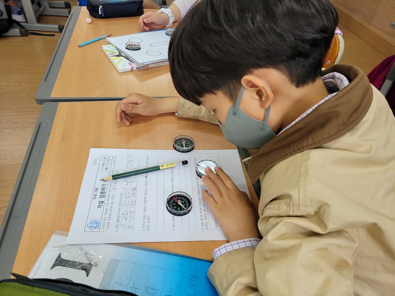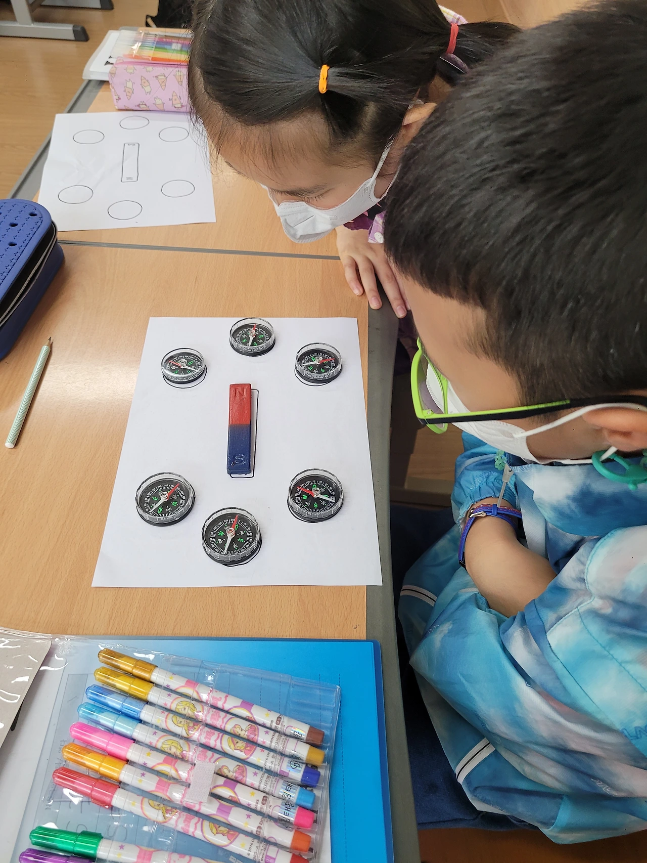 사실 아이들에게 나침반은 다소 다소 낯설고 생소한 물건입니다. 그런데 거기다가 자석까지 같이 겹치니 아이들은 다소 어려웠던 것 같습니다.