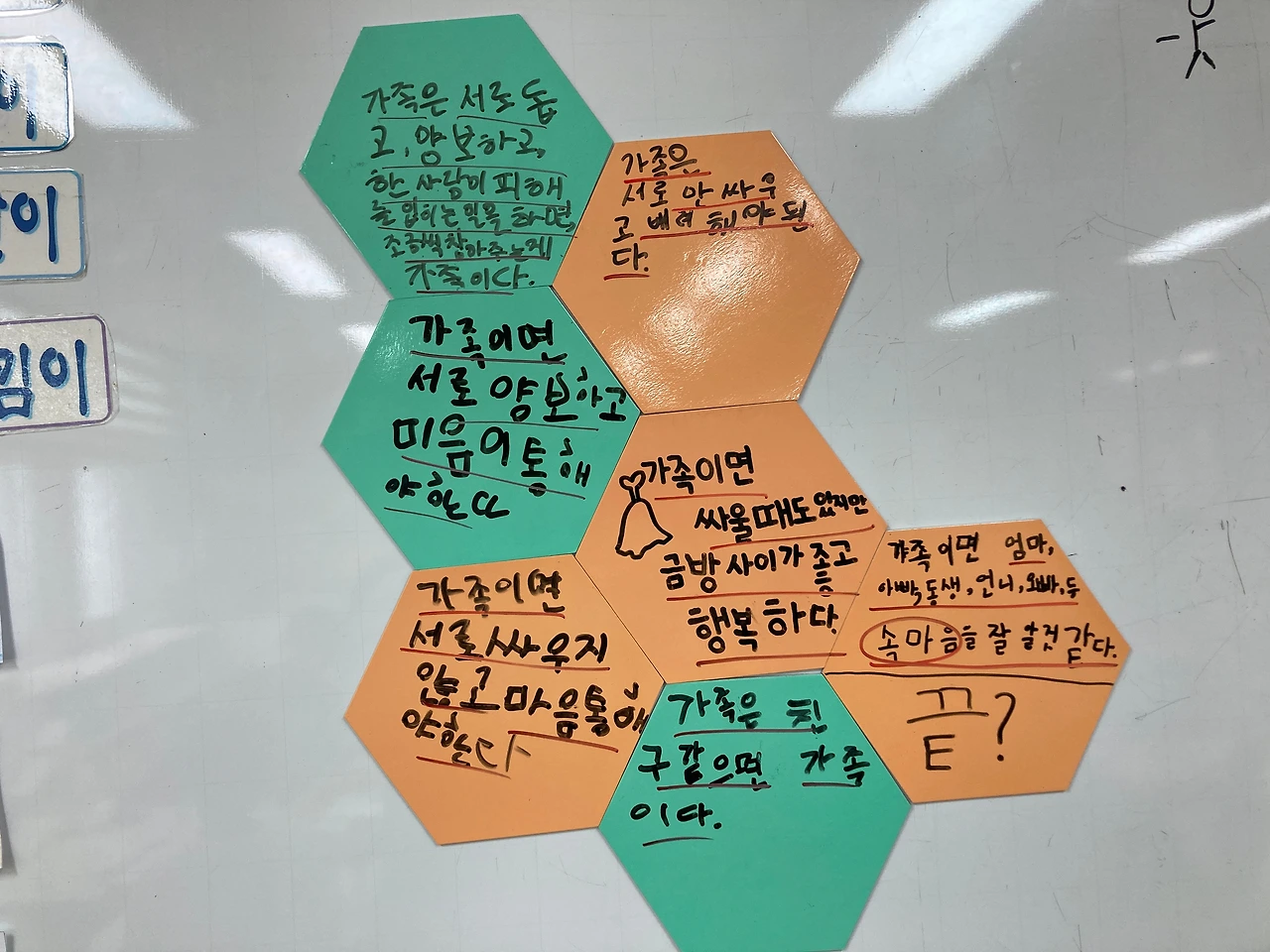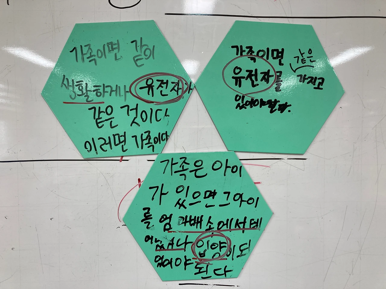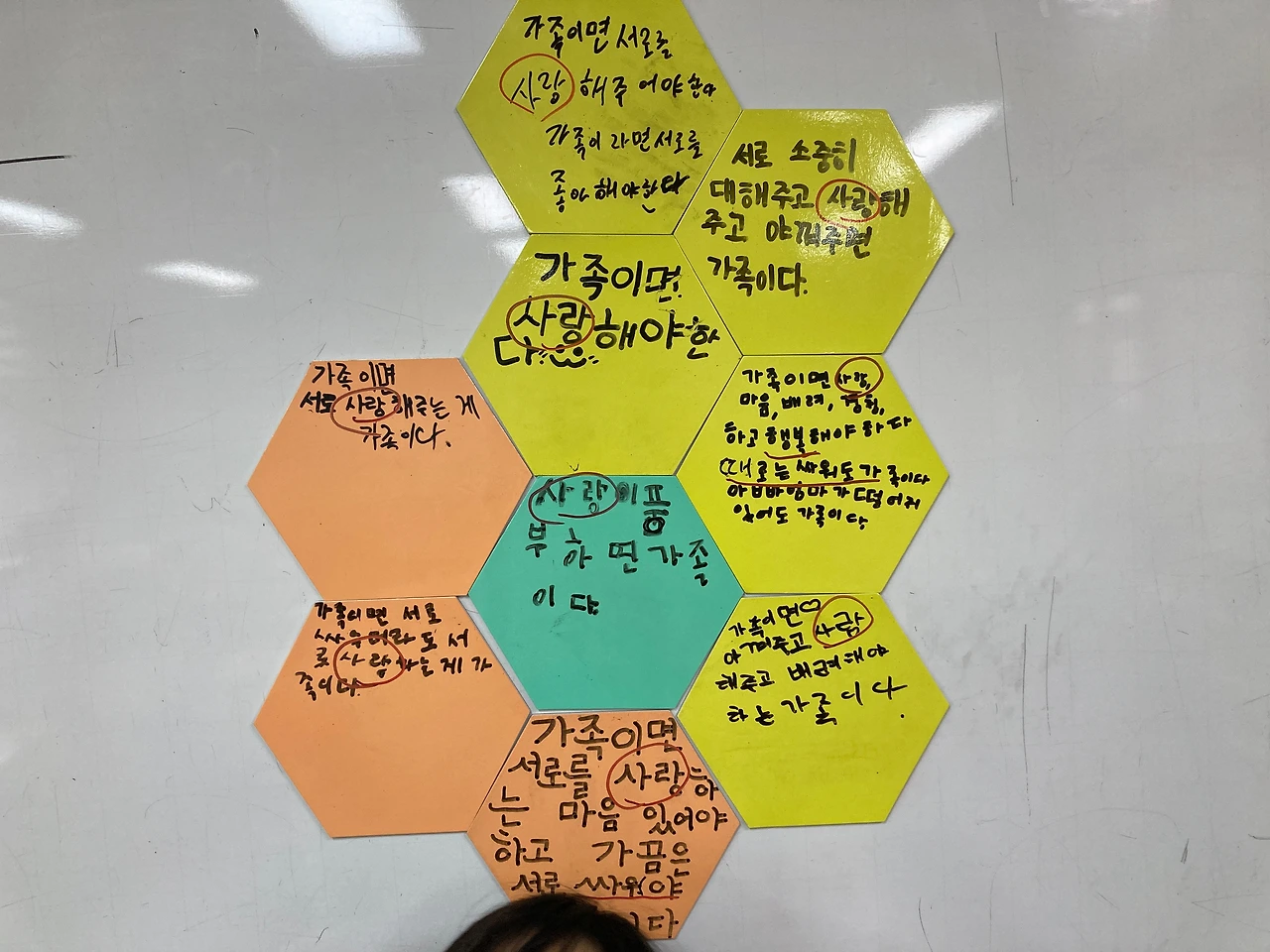 우선, 아이들에게 허니콤 보드를 나눠주고 자신이 생각한 진자 가족의 조건을 적어 봤습니다.