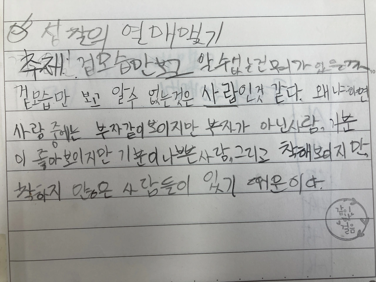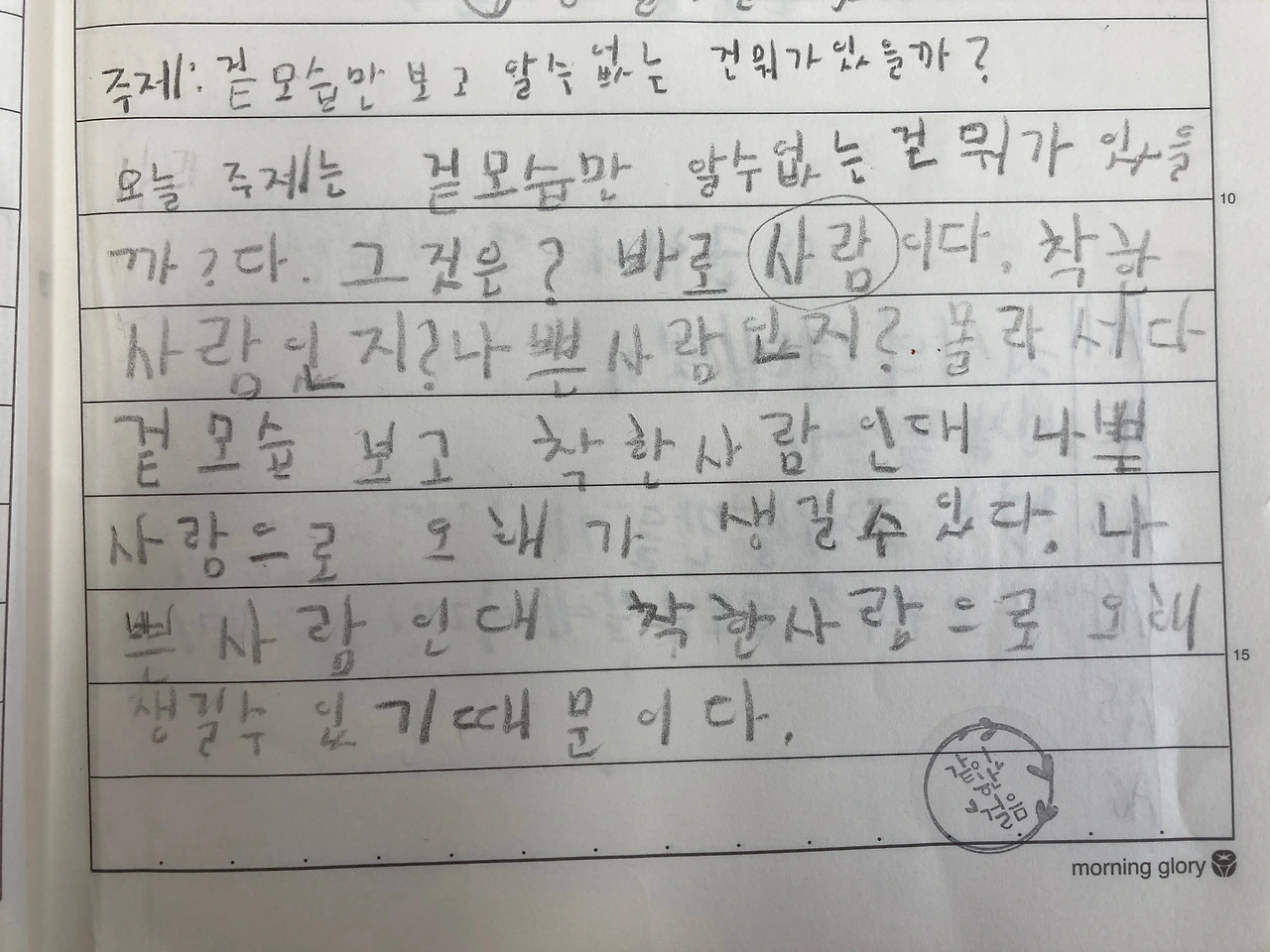 일부러 아이들의 성찰 글쓰기를 읽어 줬습니다. 겉모습만 보고 진짜인지 가짜 인지 알 수 없는 것에 대한 아이들의 글이 인상적입니다.