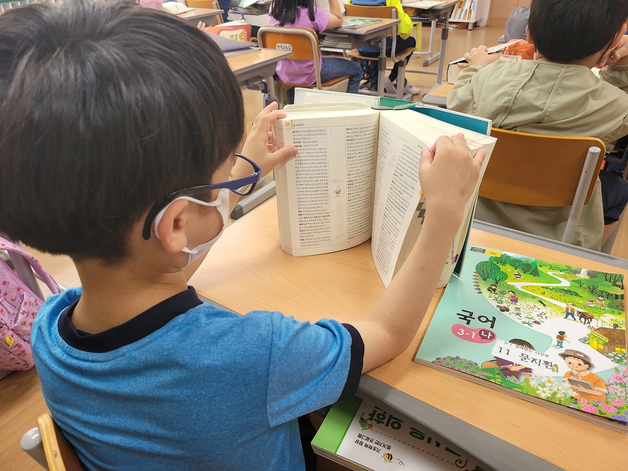 아이들이 지난 시간에 이어서 국어사전 찾는 법을 배웁니다. 온 작품 읽기를 하는 동안 항상 책상 위에 두고 필요할 때마다 찾아보게 하려 합니다.