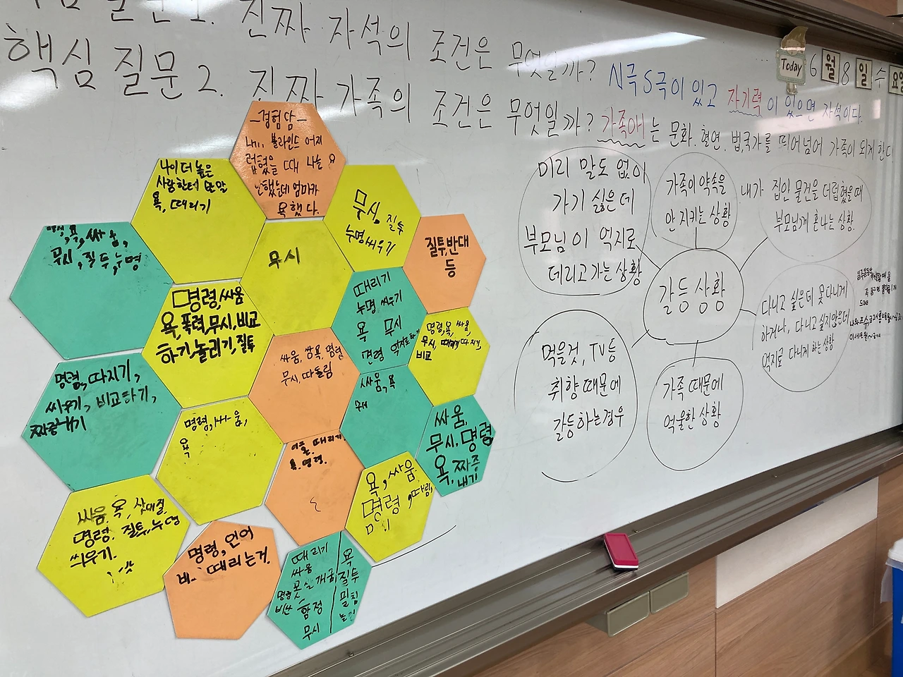 오늘은 더 나아가기 2번째 시간으로 가족 간의 갈등에 대해 이야기해 보았습니다. 갈등 이야기를 하니 아이들 이야기가 여기저기 터져 나오네요~, 가끔은 아이들이 너무 솔직해서 제가 좀 당황하기도 합니다.