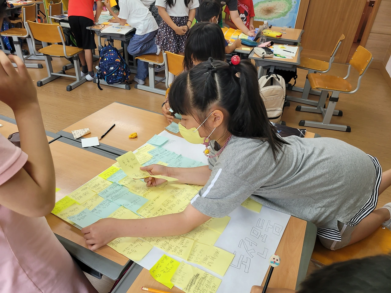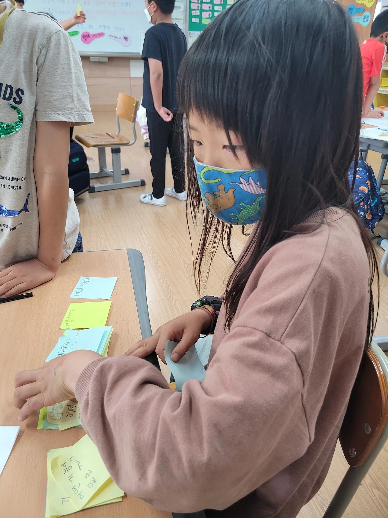 이 네 가지 마법사를 이용해서 질문을 만들라고 했습니다. 그리고 어떤 질문이던 상관없다고 합니다. 그럼에도 불구하고 이 시간에 가장 괴로운 건 바로 접니다. 아이들은 오랜 습관에 따라 "농부님, 이거 해도 돼요?" "농부님, 이 질문도 돼요?" 하고 물어 옵니다. 이때 필터링하고 싶은 마음을 내려놓고 "응 그래 뭐든지 상관없어"라고 참아내는 것이 가장 힘듭니다. 그러나 그 단계를 넘어서면 아이들의 질문은 봇물 터지듯 터져 나옵니다. 포스트잇이 부족할 지경입니다.