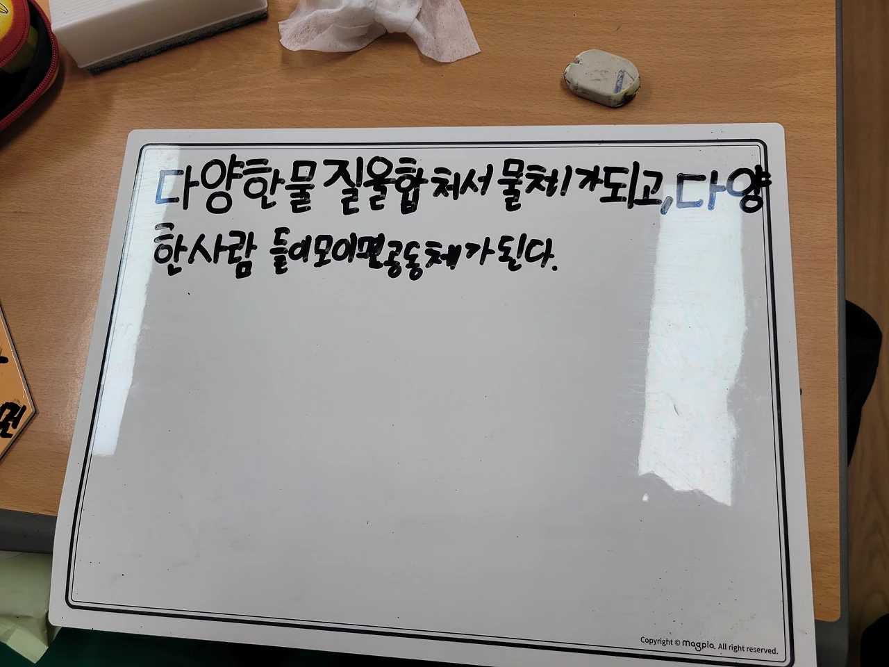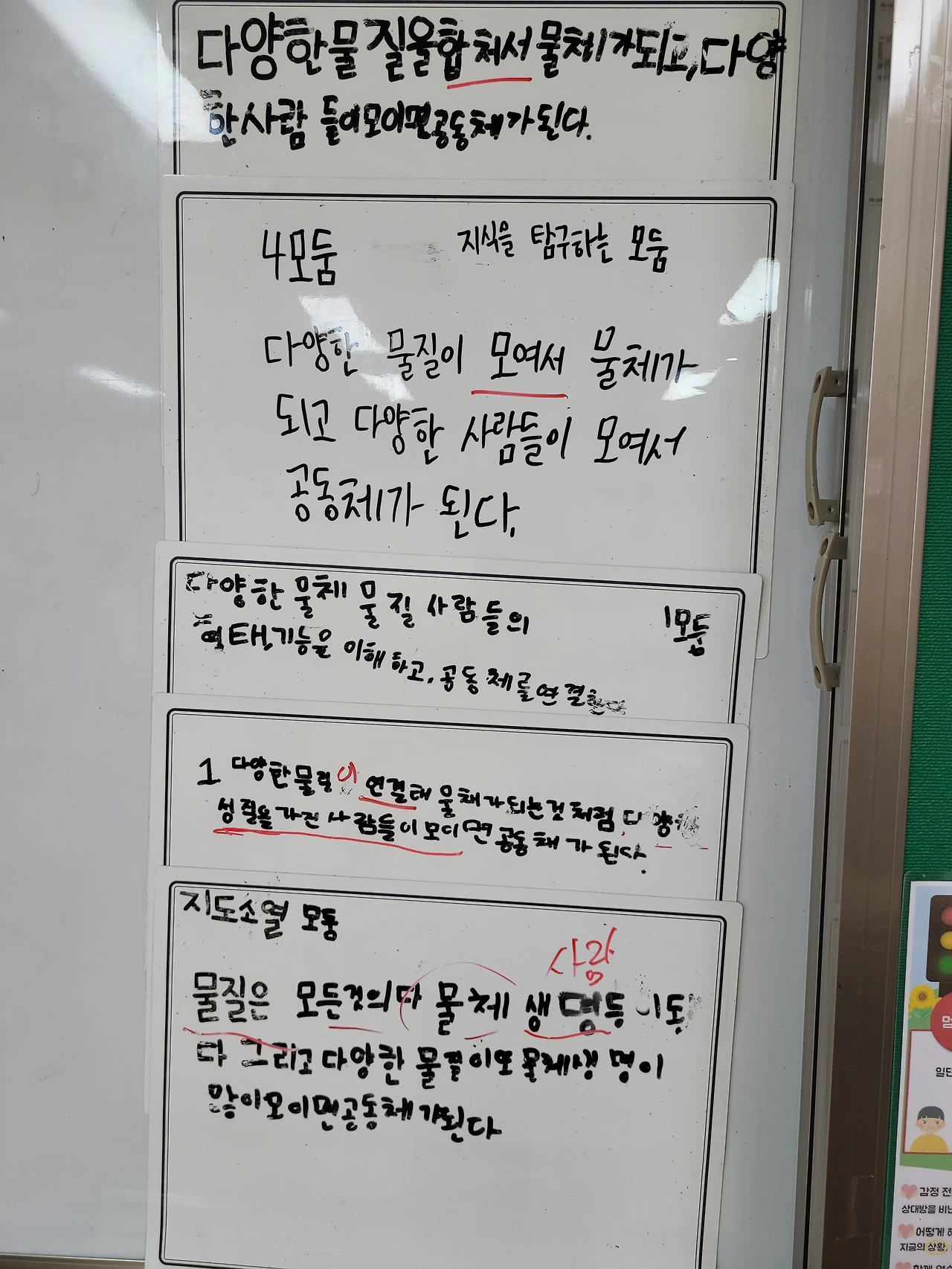 아이들과 함께 이번 단원의 중심 아이디어를 "다양한 물질이 연결되어 물체가 되고, 다양한 사람들이 모여 공동체가 된다."로 정했습니다.