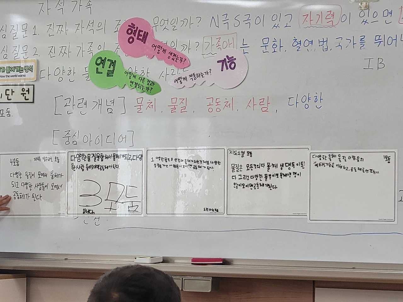 지난 시간에, 아이들이 이번 단원에서 공부하게 될 관련 개념을 물질, 물체, 사람, 공동체라고 뽑아냈습니다. 오늘은 이 관련 개념을 기능, 형태, 연결이라는 핵심 개념의 렌즈에 비춰서 "중심 아이디어"로 만드는 시간을 가졌습니다. 중심 아이디어란? 이번 단원을 이끌어갈 가설 같은 것입니다. 이 중심 아이디어가 진짜 그러한지 탐구해 나가야 하기에 중심 아이디어에 따라 공부하는 방향도 달라집니다. 1,2 단원에서는 교사가 중심 아이디어를 정해서 아이들을 끌고 갔다면, 이번에는 아이들이 중심 아이디어를 정하고, 탐구 질문도 정하게 됩니다. 그래서 오늘 공부가 아주 중요합니다.