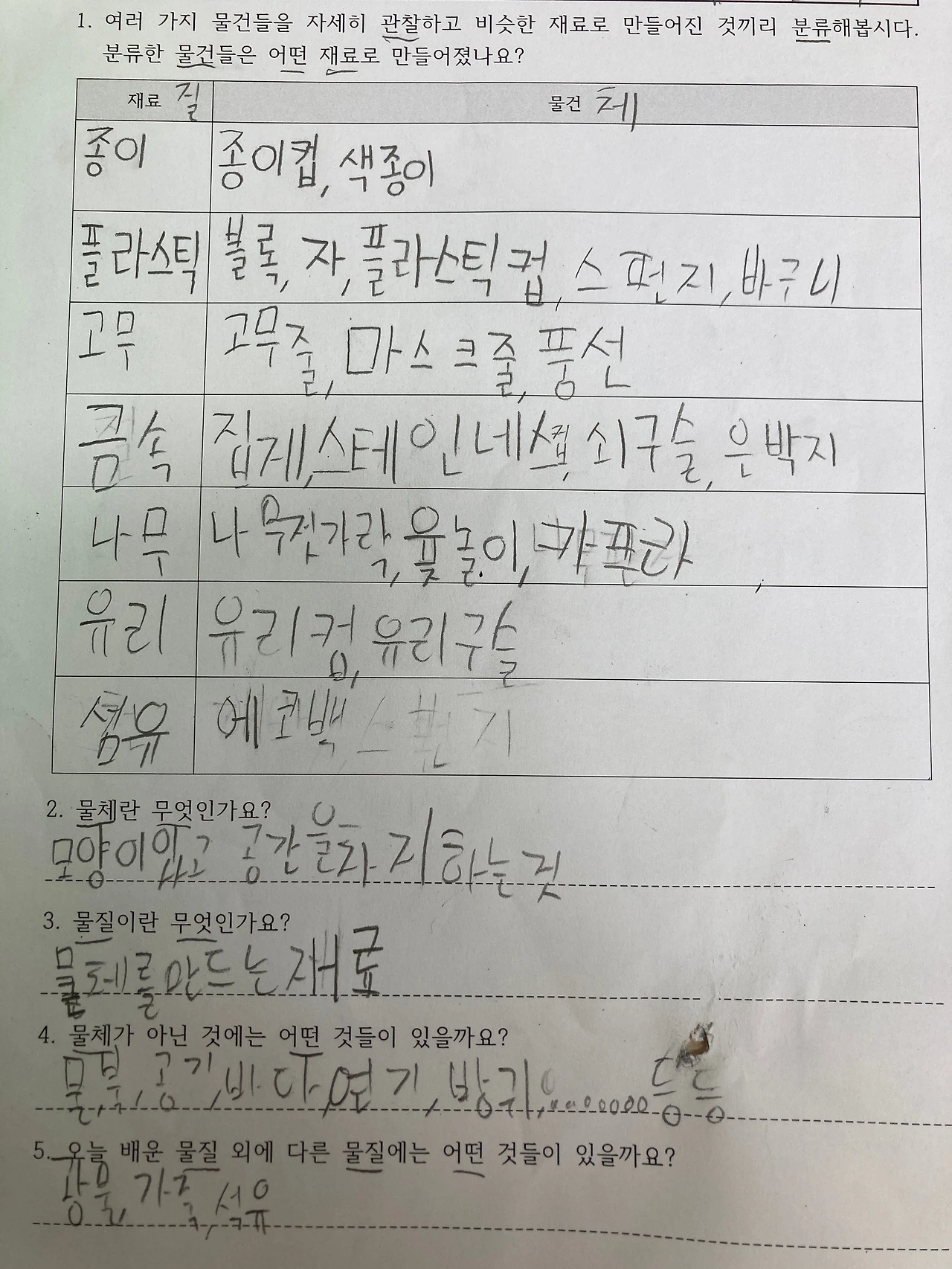 먼저 아이들의 탐구 질문 중 물질이 뭐고 , 물체가 무엇인지? 그리고 한 가지 물질로도 물체가 될 수 있는지 해결해 보기로 했습니다.