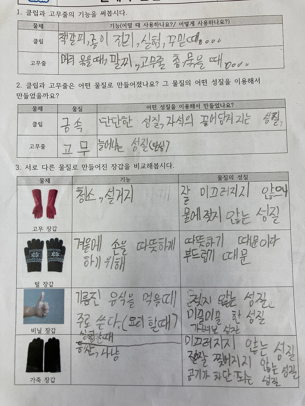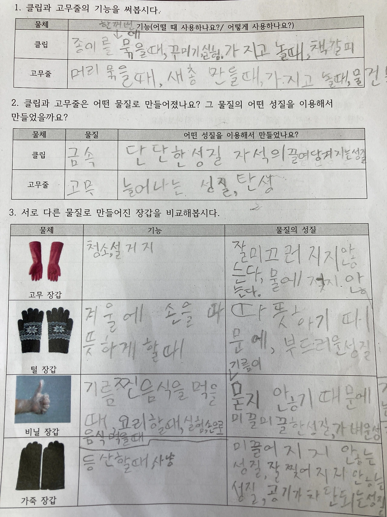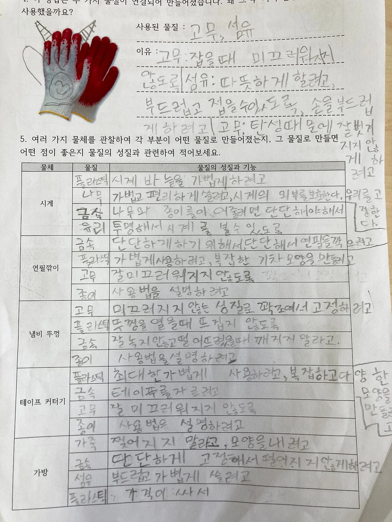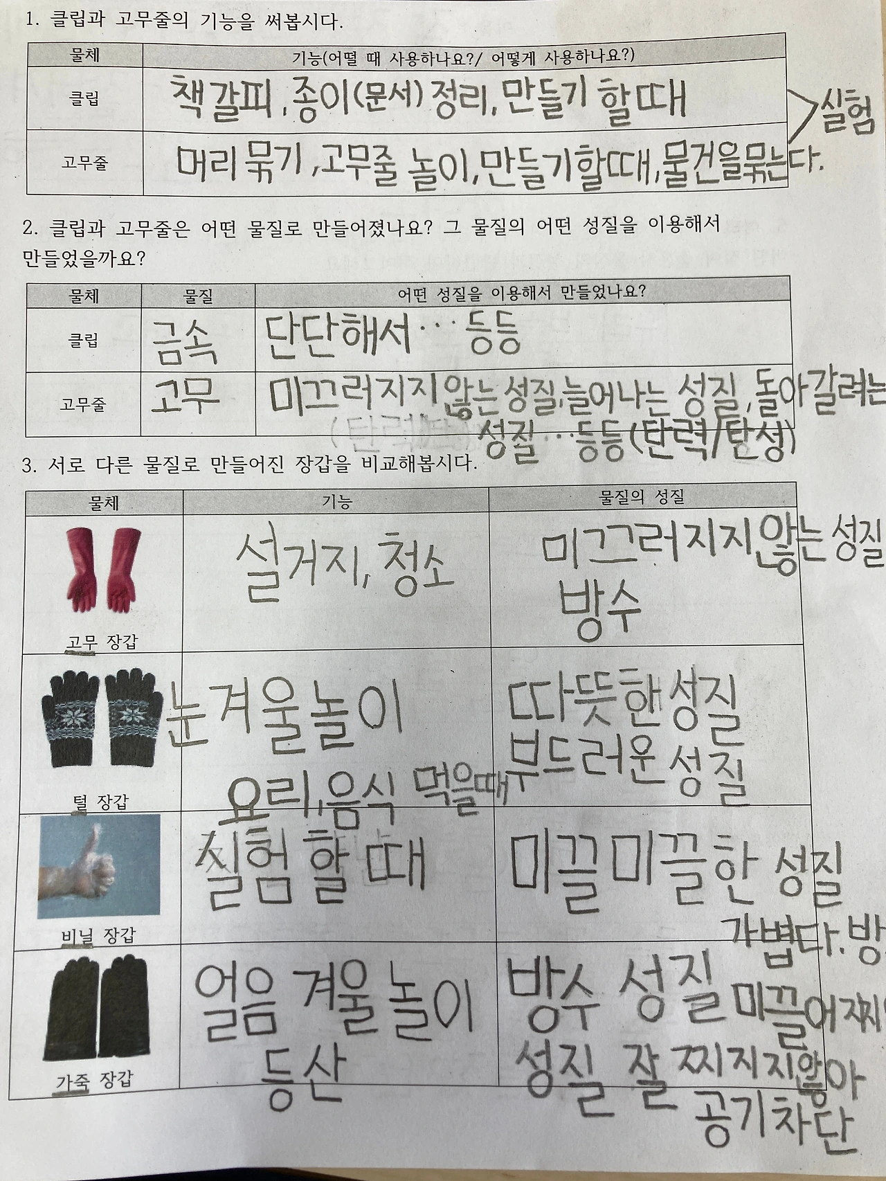 2. 같은 장갑이지만, 각각 다른 물질로 만든 장갑을 보고 그 성질과 기능의 차이 연결하기