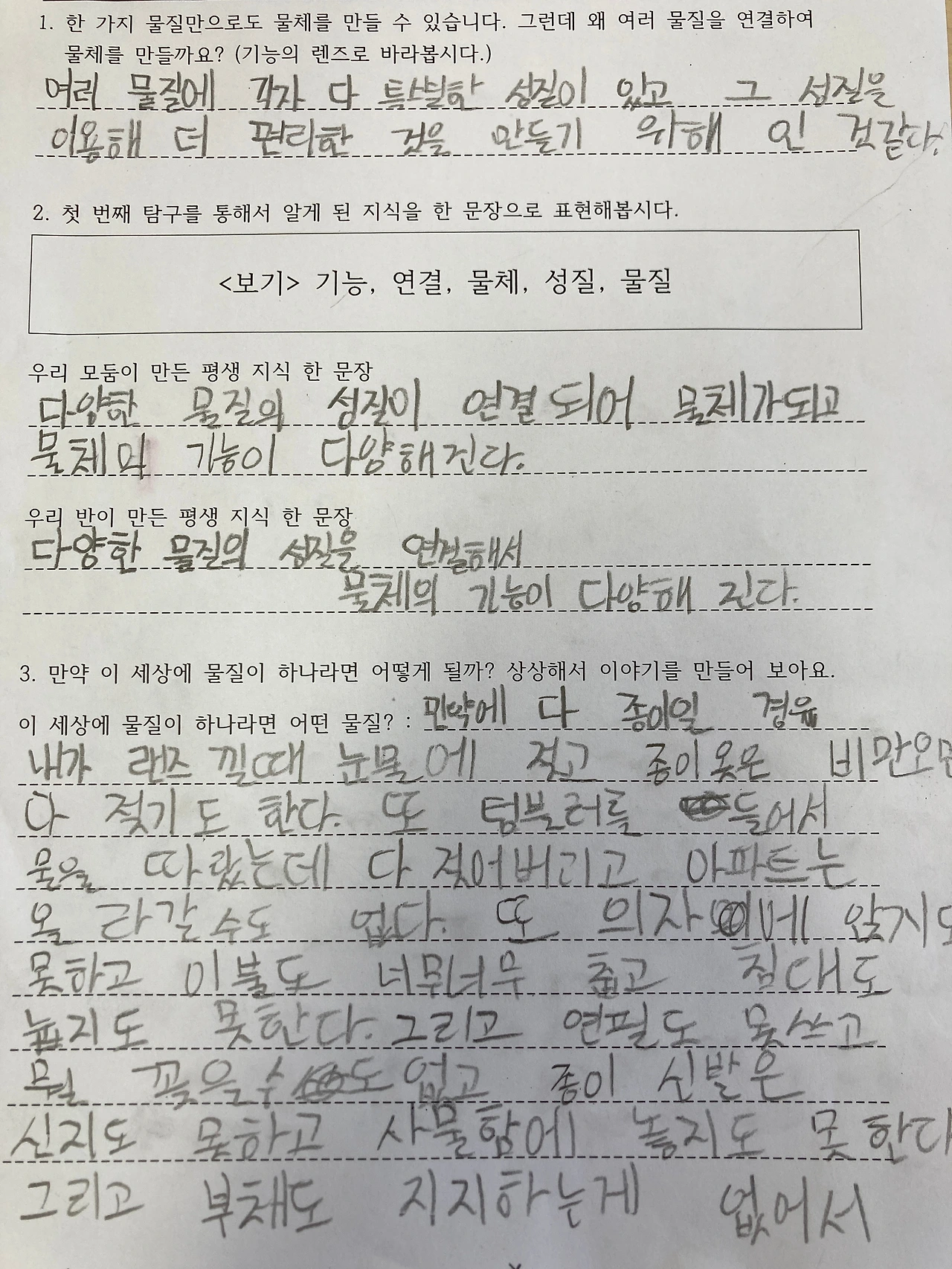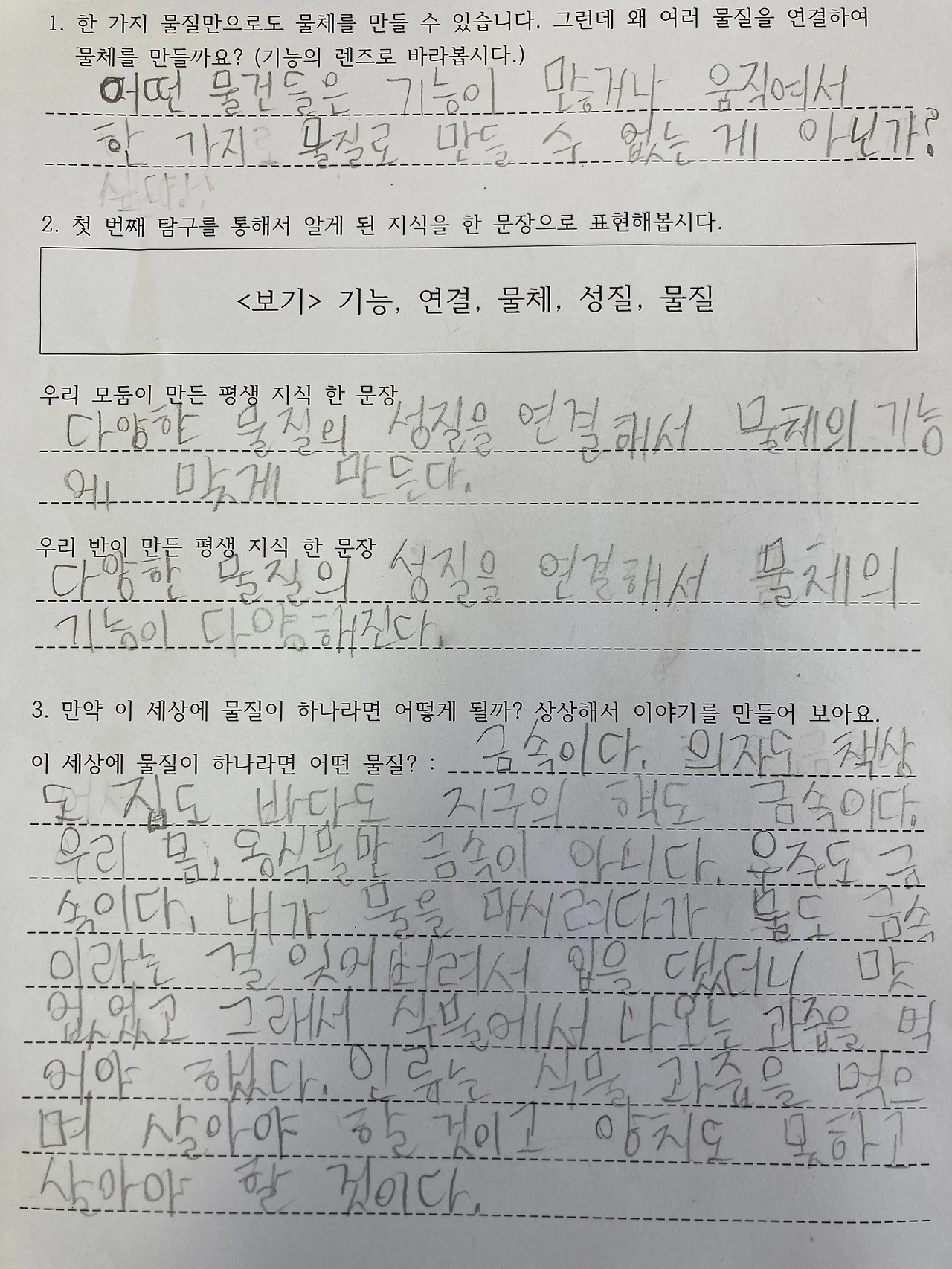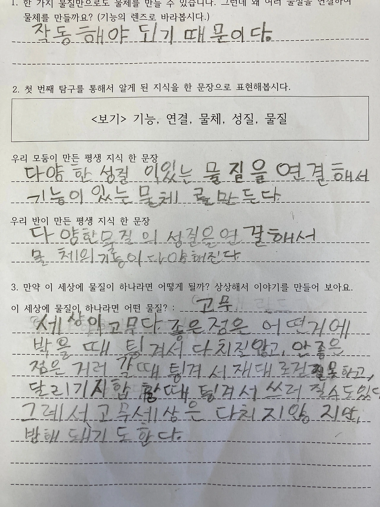 한 가지 물질로도 기능이 있는 물체를 만들 수 있다는 학생의 질문이 반영되어 적절한 일반화 문장이 나온 것 같아 매우 흐뭇했습니다.
