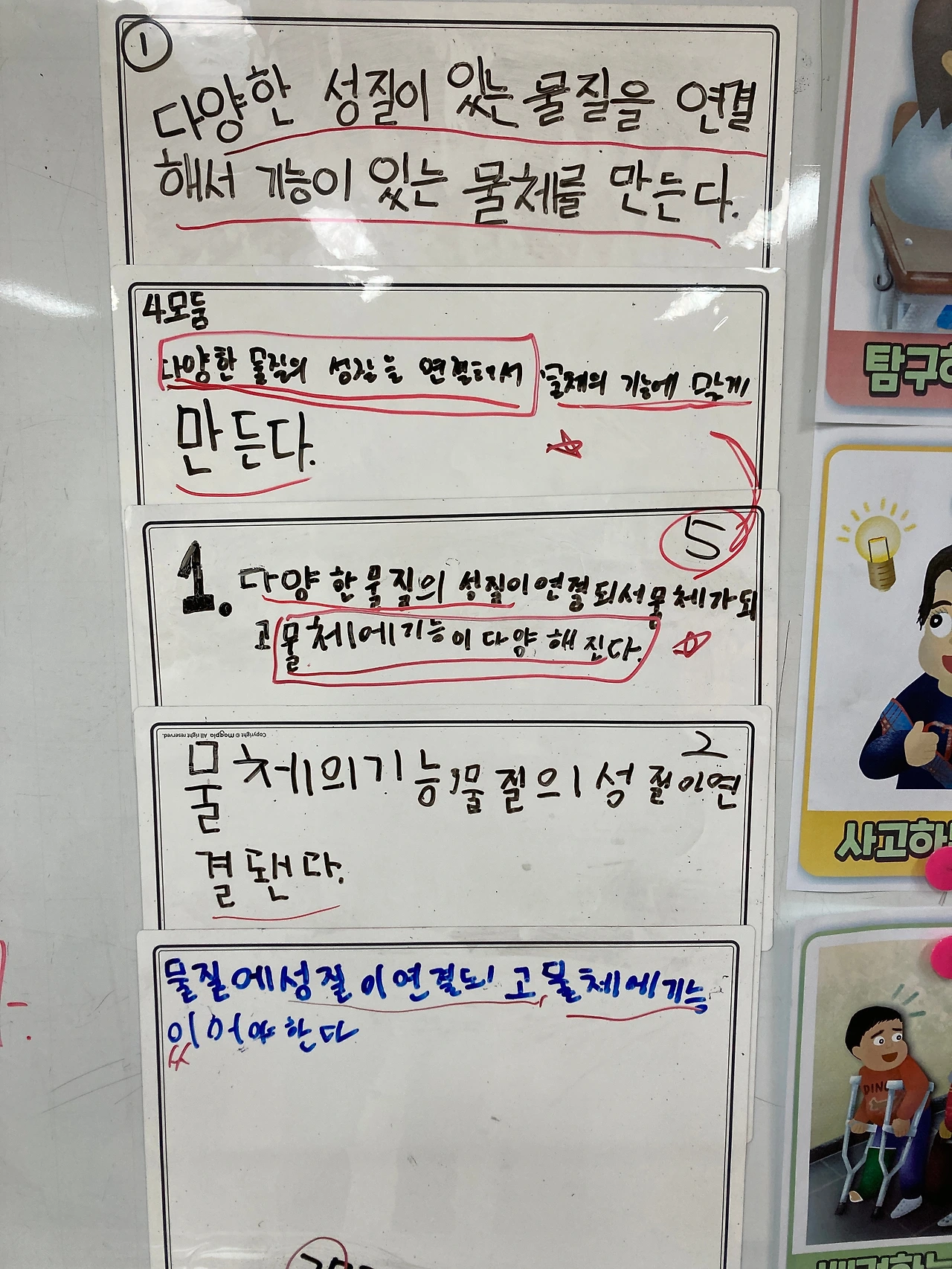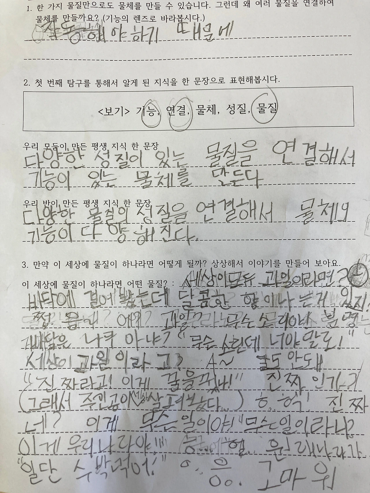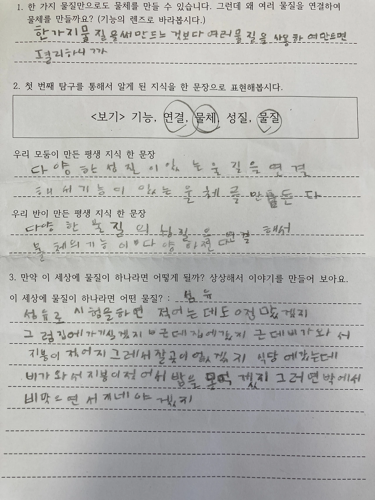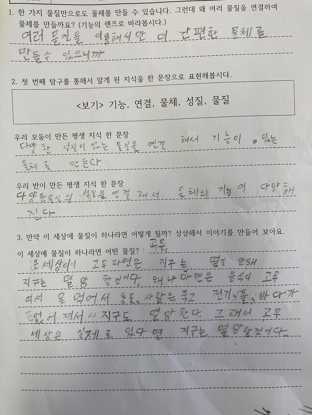 한 가지 물질로도 기능이 있는 물체를 만들 수 있다는 학생의 질문이 반영되어 적절한 일반화 문장이 나온 것 같아 매우 흐뭇했습니다.