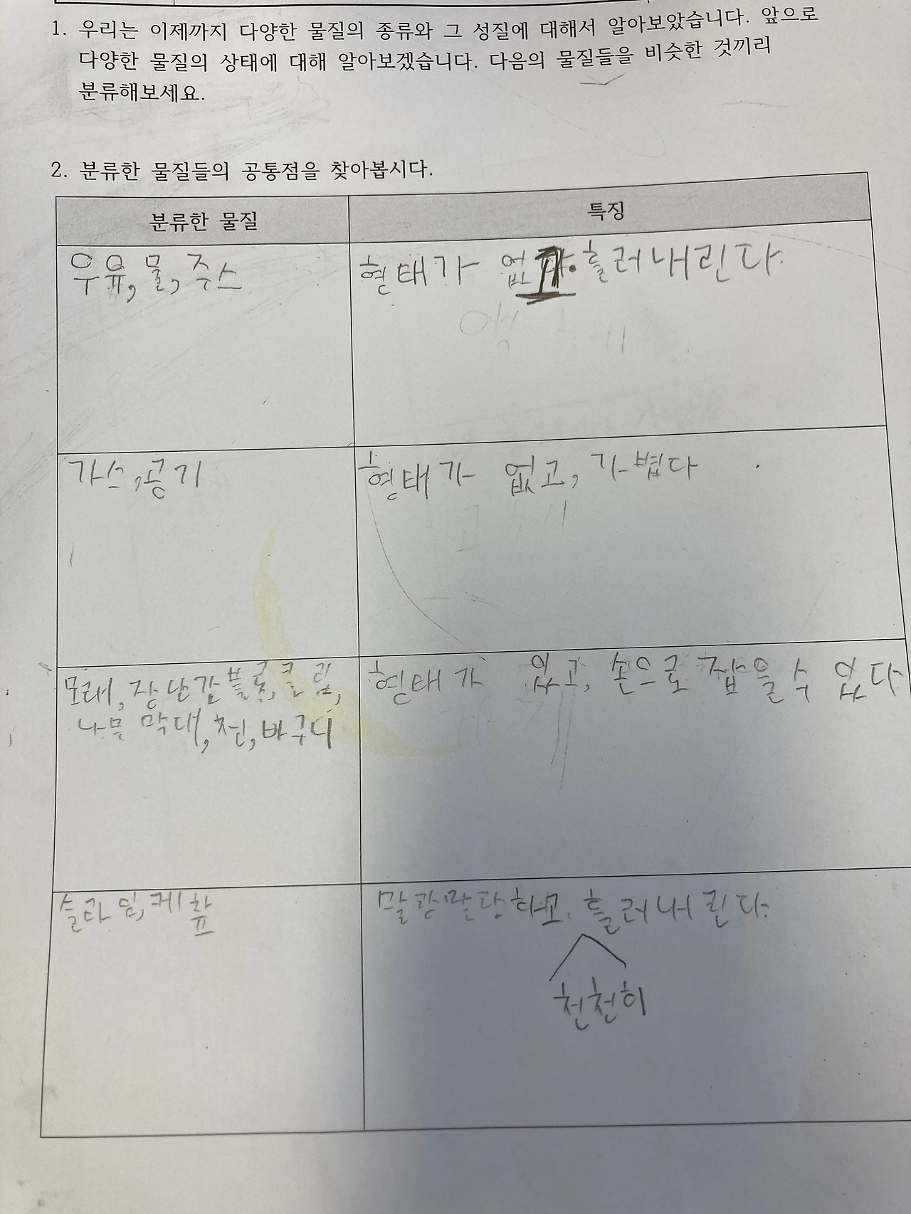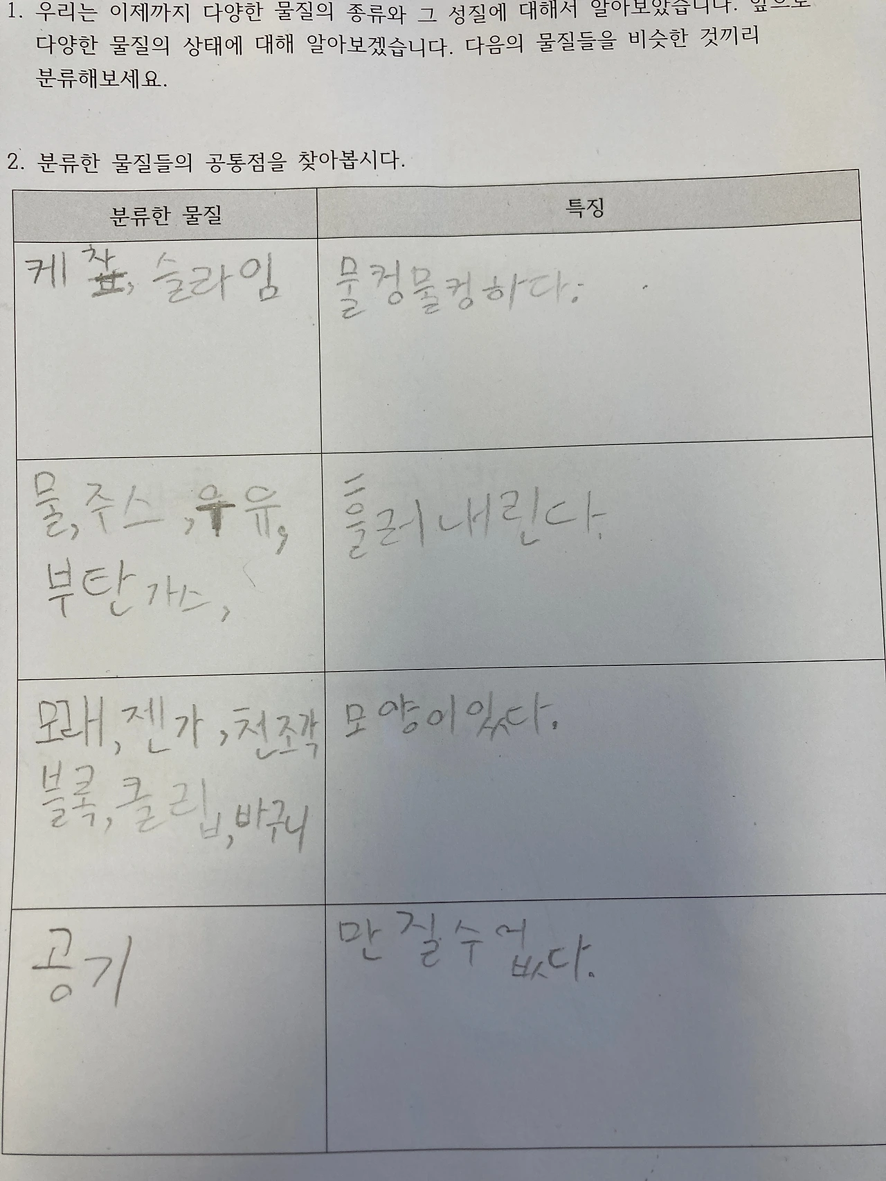 아이들 사이에 혼란이 가득합니다. 케첩을 어디에다 분류해야 할지, 슬라임을 어디에 분류해야 할지 아이들끼리 난상 토론이 벌어집니다.