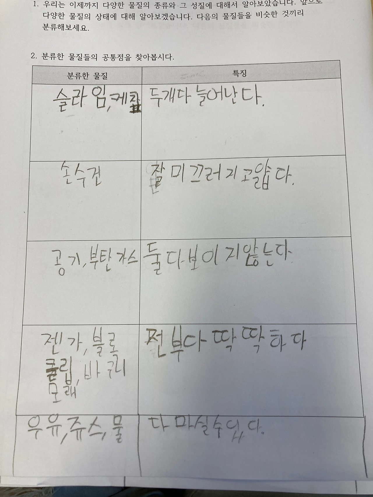 그런 다음 각 모둠에서 어떻게 분류했는지 함께 이야기 나누고 각각의 그룹의 특징이 무엇인지 모둠별로 역시 의논해서 써보도록 합니다. 분류한 내용이 다르기에 특징도 다양합니다.