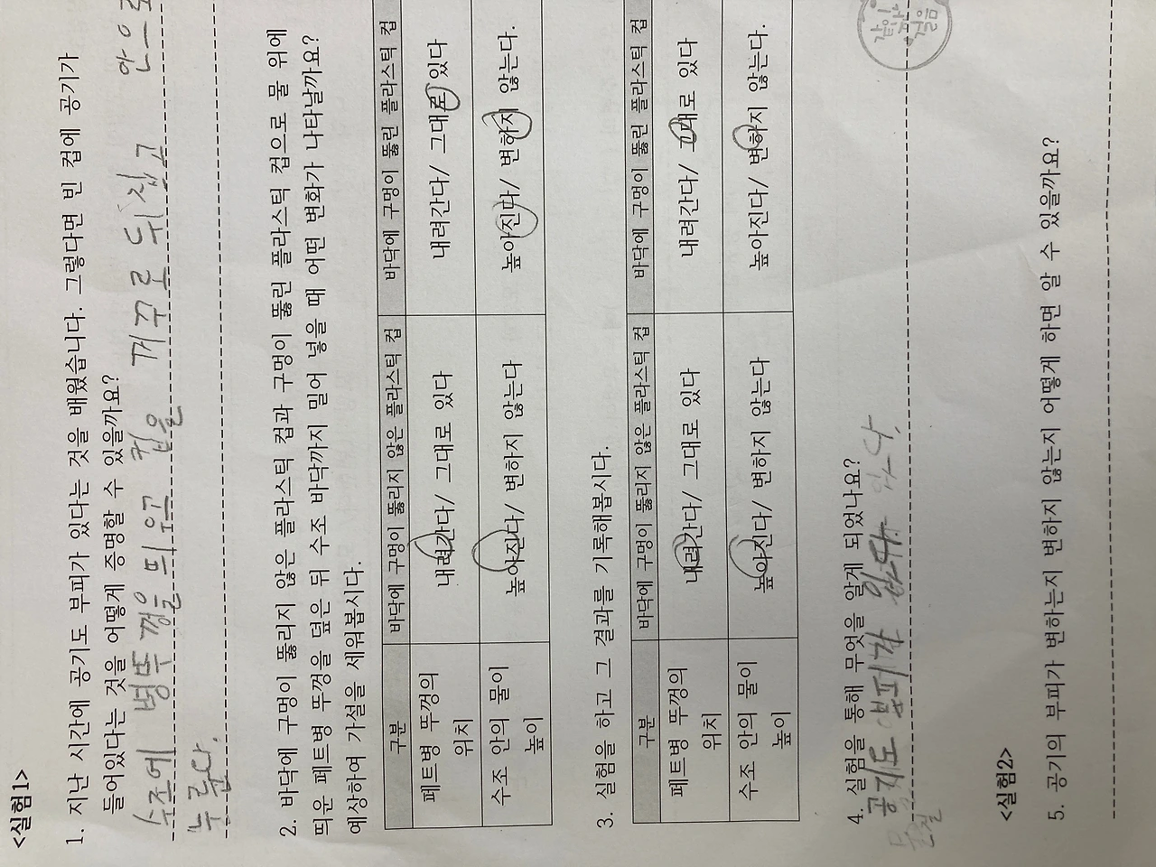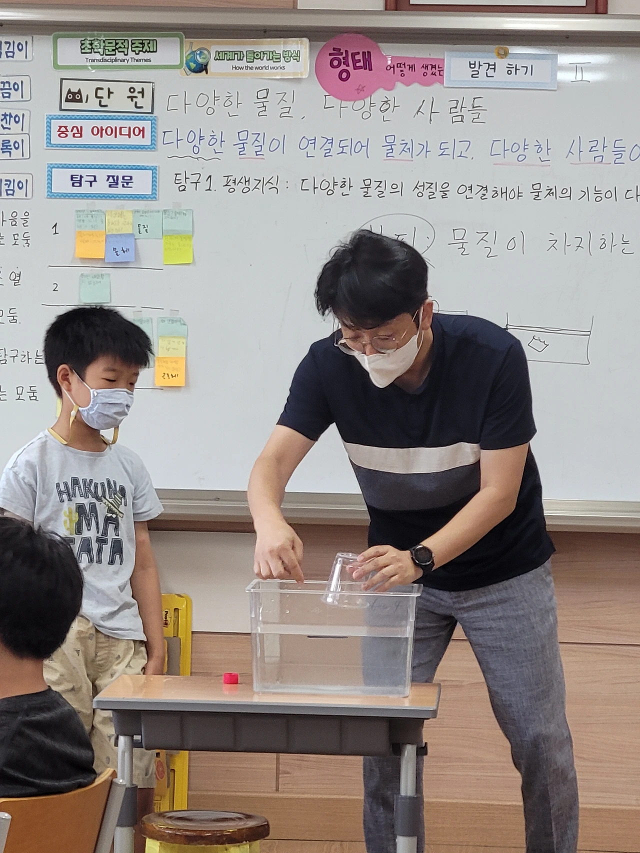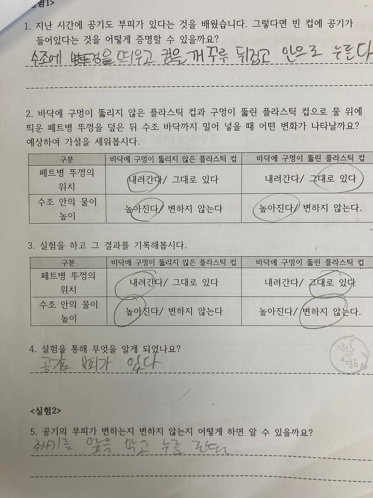 2~3교시는 아이들과 함께 "공기"에 대해서 알아 보았습니다. 빈컵에 공기가 들어있다는 사실을 어떻게 증명할까? 어떻게 동생들에게 이해 시킬까? 아이들이 기가막힌 아이디어를 제시해 줬고, 아이들이 제시한 아이디어로 실험을 설계해서 진행해 보았습니다.
