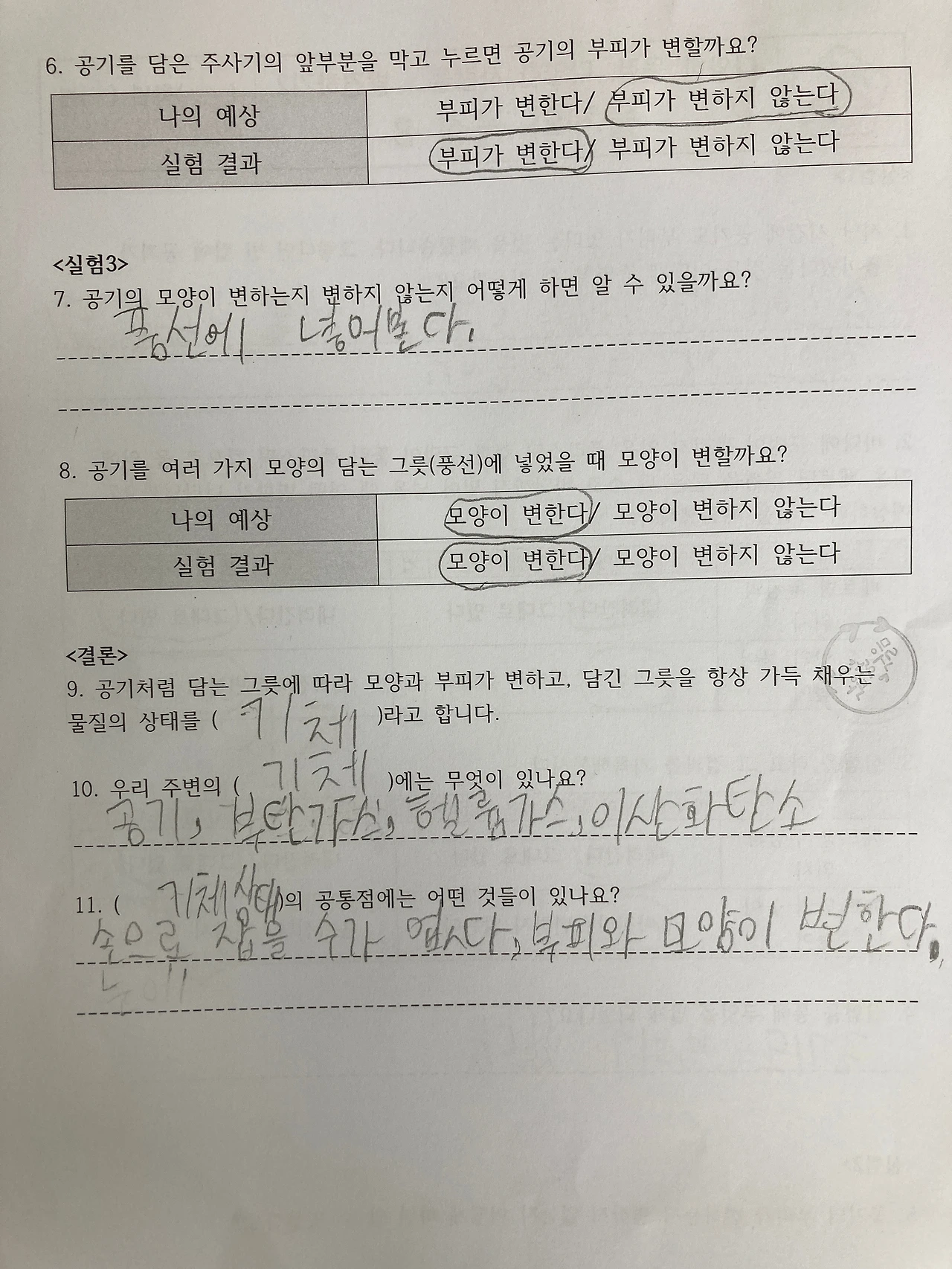 이후에는 고체와 기체를 정의 할때 했던것 처럼 공기는 담는 그릇에 따라 모양이 변할까? 공기는 부피가 변할까? 함께 알아보았습니다.