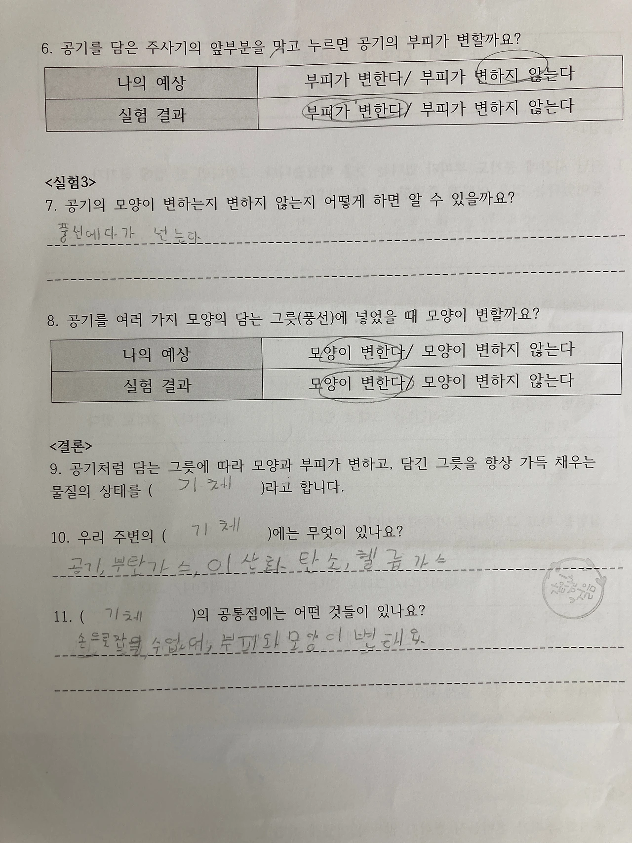 그리고는 결론 내리기를 통해 기체는 담는 그릇에 따라 모양과 부피가 변한다는 정의를 내립니다.