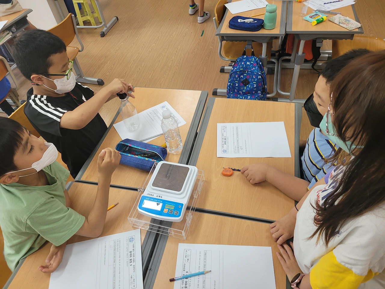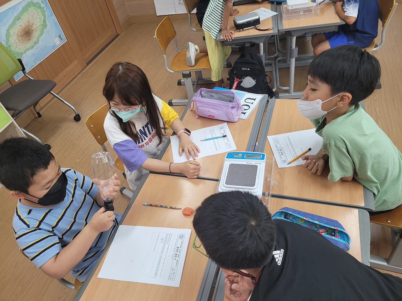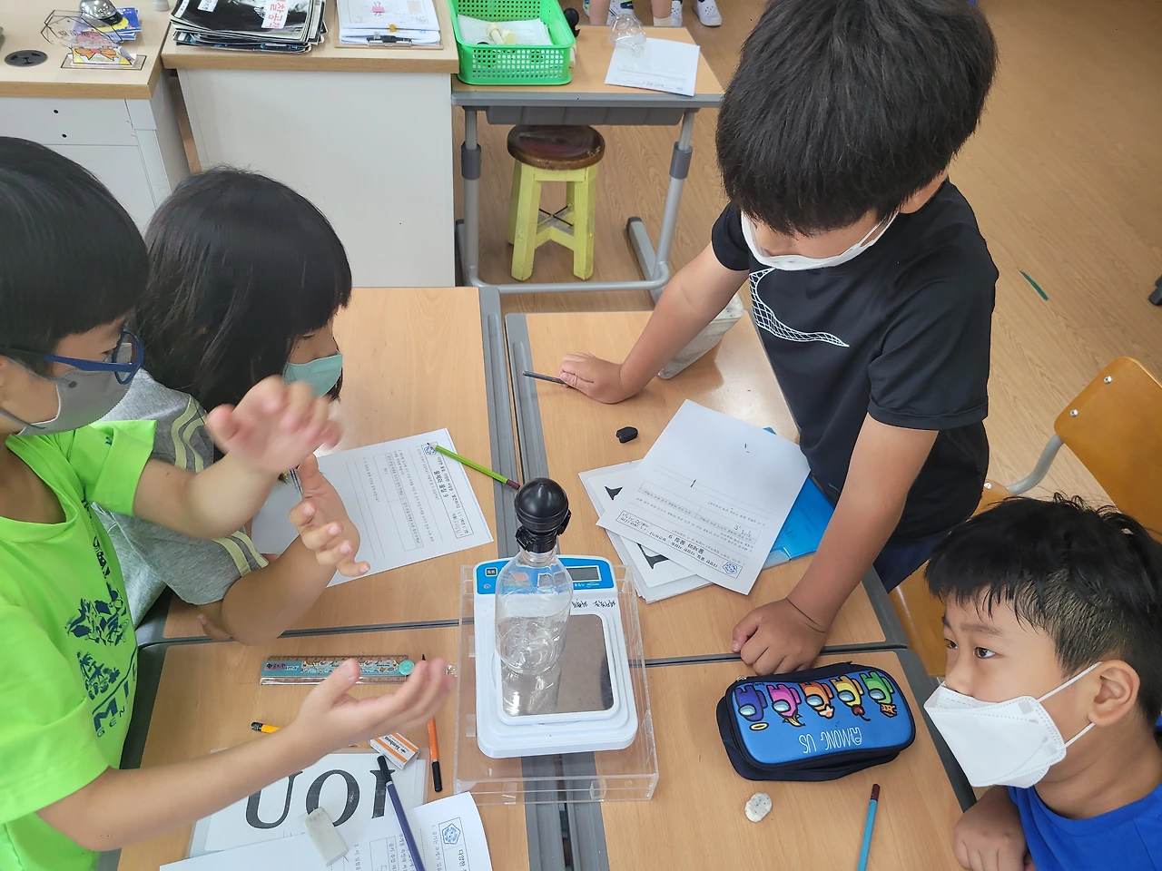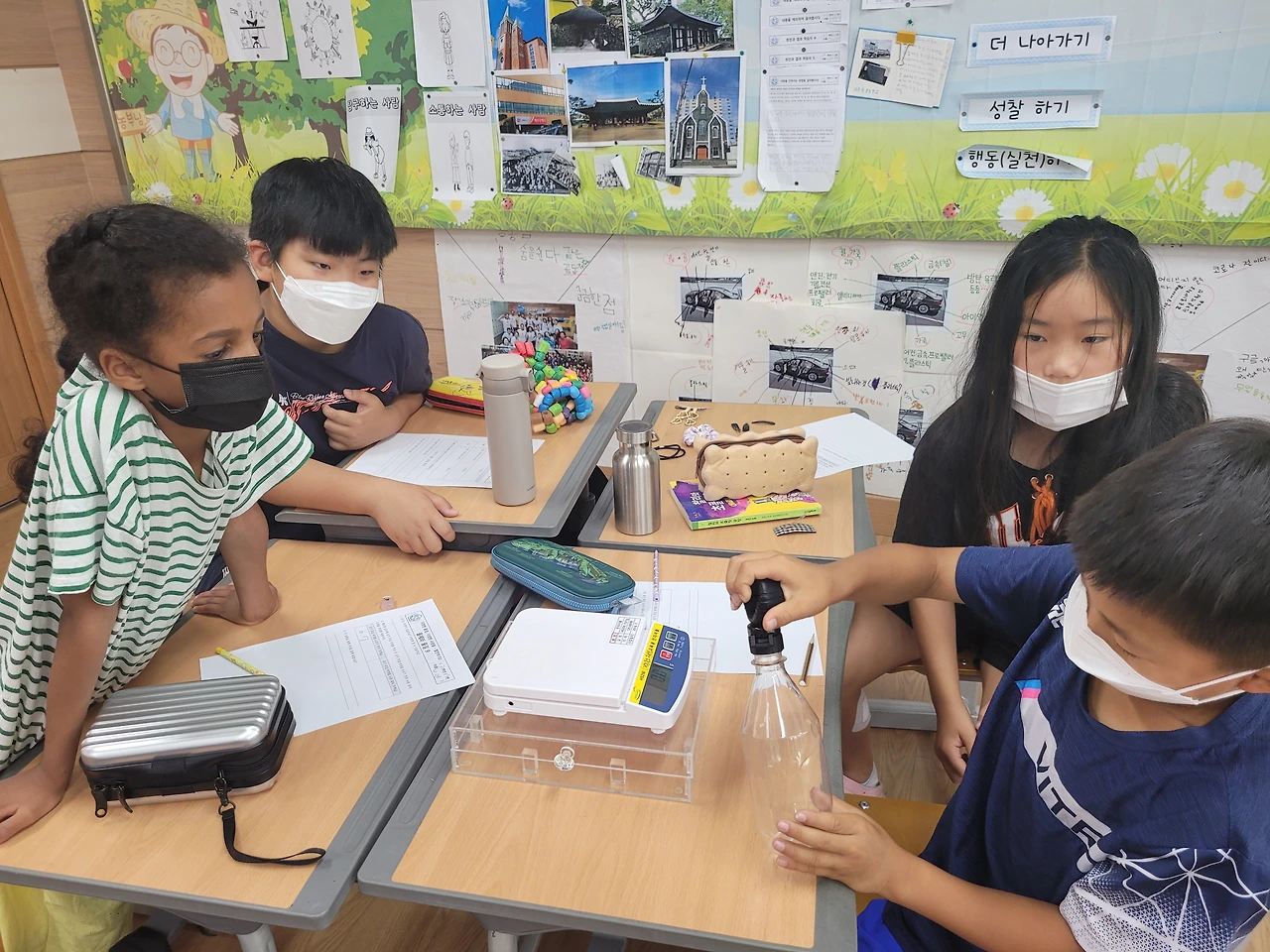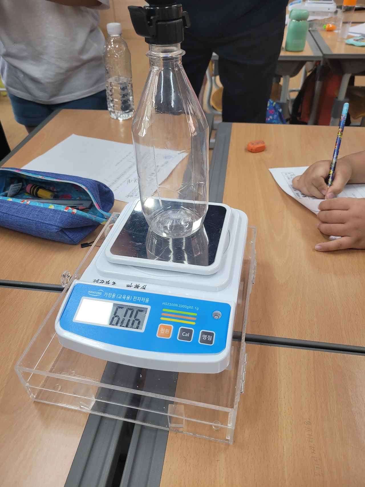 3. 가설 검증 단계: 아이들은 먼저 찌그러진 페트병과 공기 주입장치의 무게를 측정합니다. 그리고 공기 주입기로 공기를 가득 넣은 후 무게를 측정합니다.