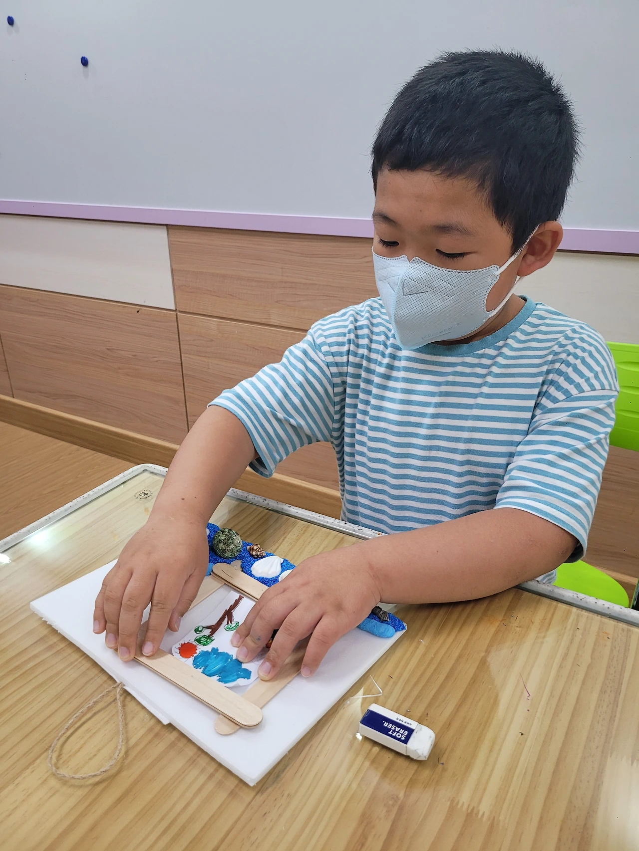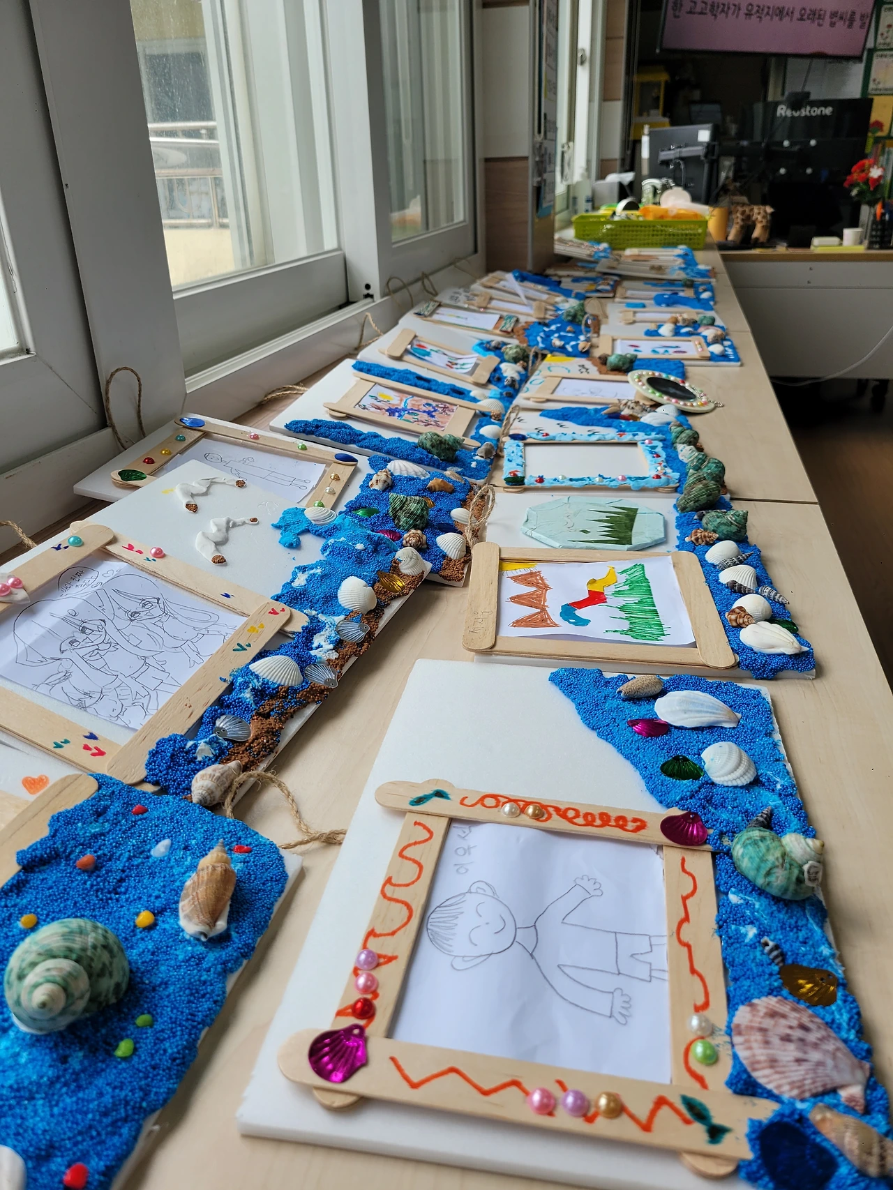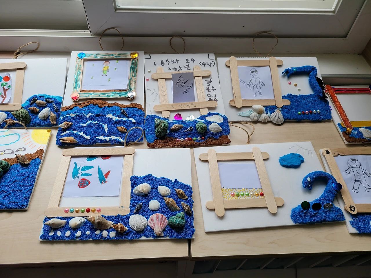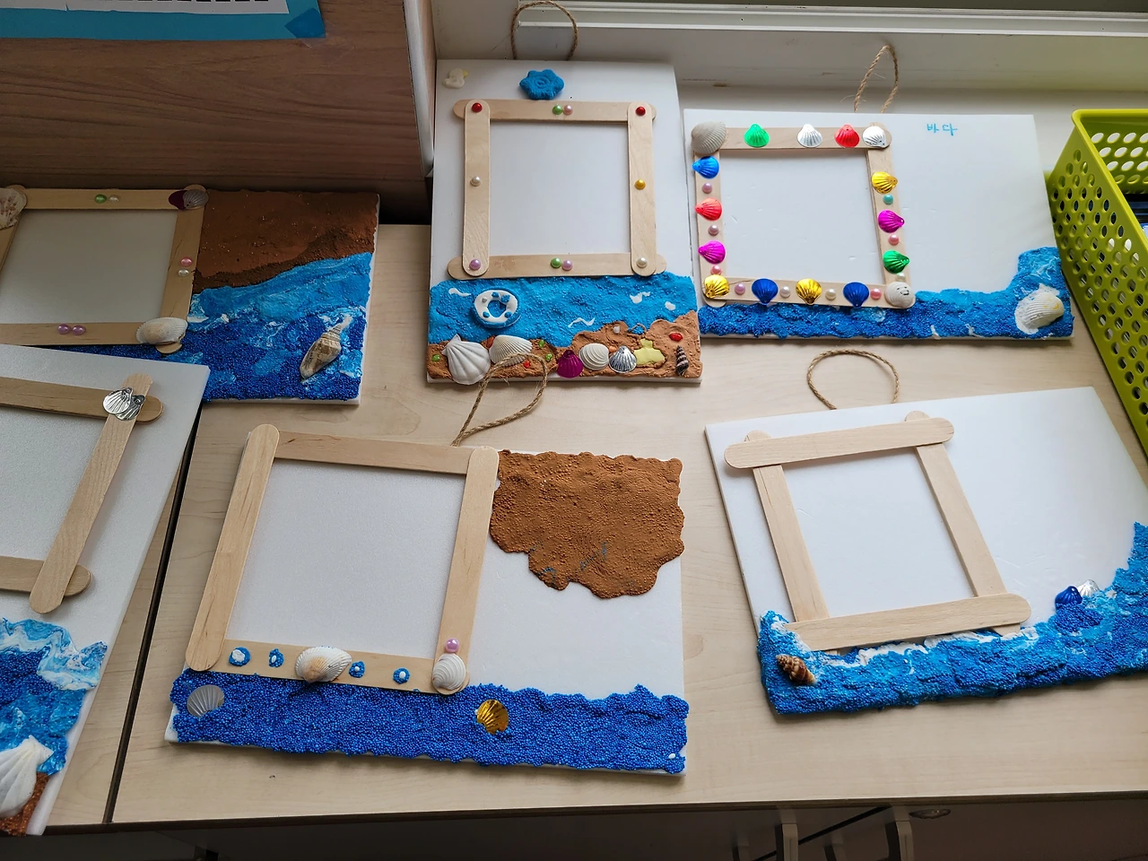 오늘은 지난주에 이어 공예 수업도 했습니다. 아이들이 지난주에 만든 거울과 이번 주에 만든 액자를 집에 가지고 갈 겁니다. 바로 쓰레기통에 들어가지 않도록 잘 관리해주세요!