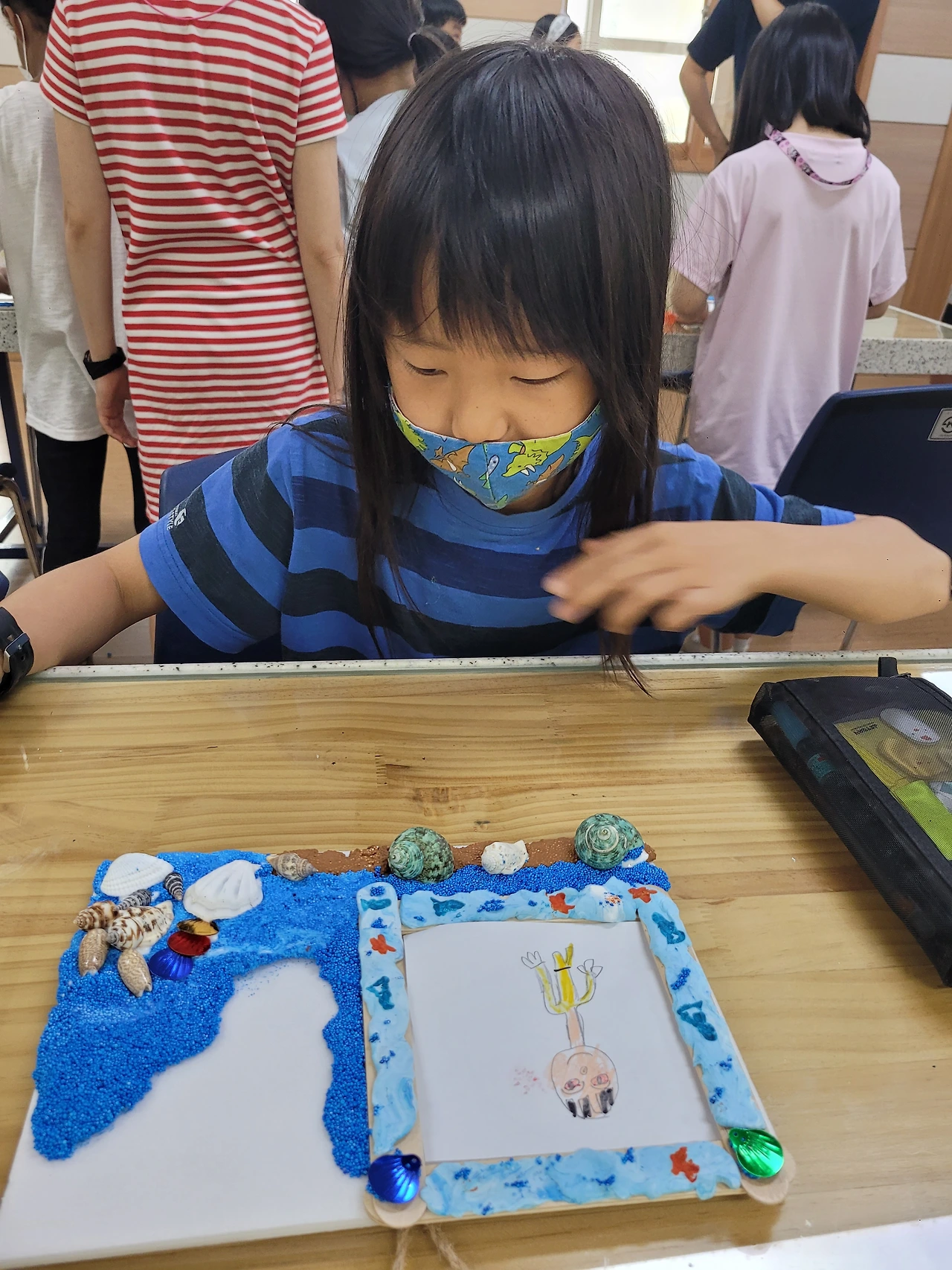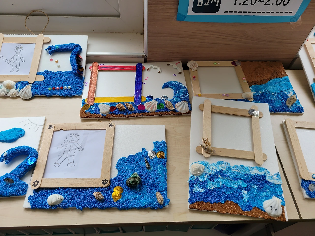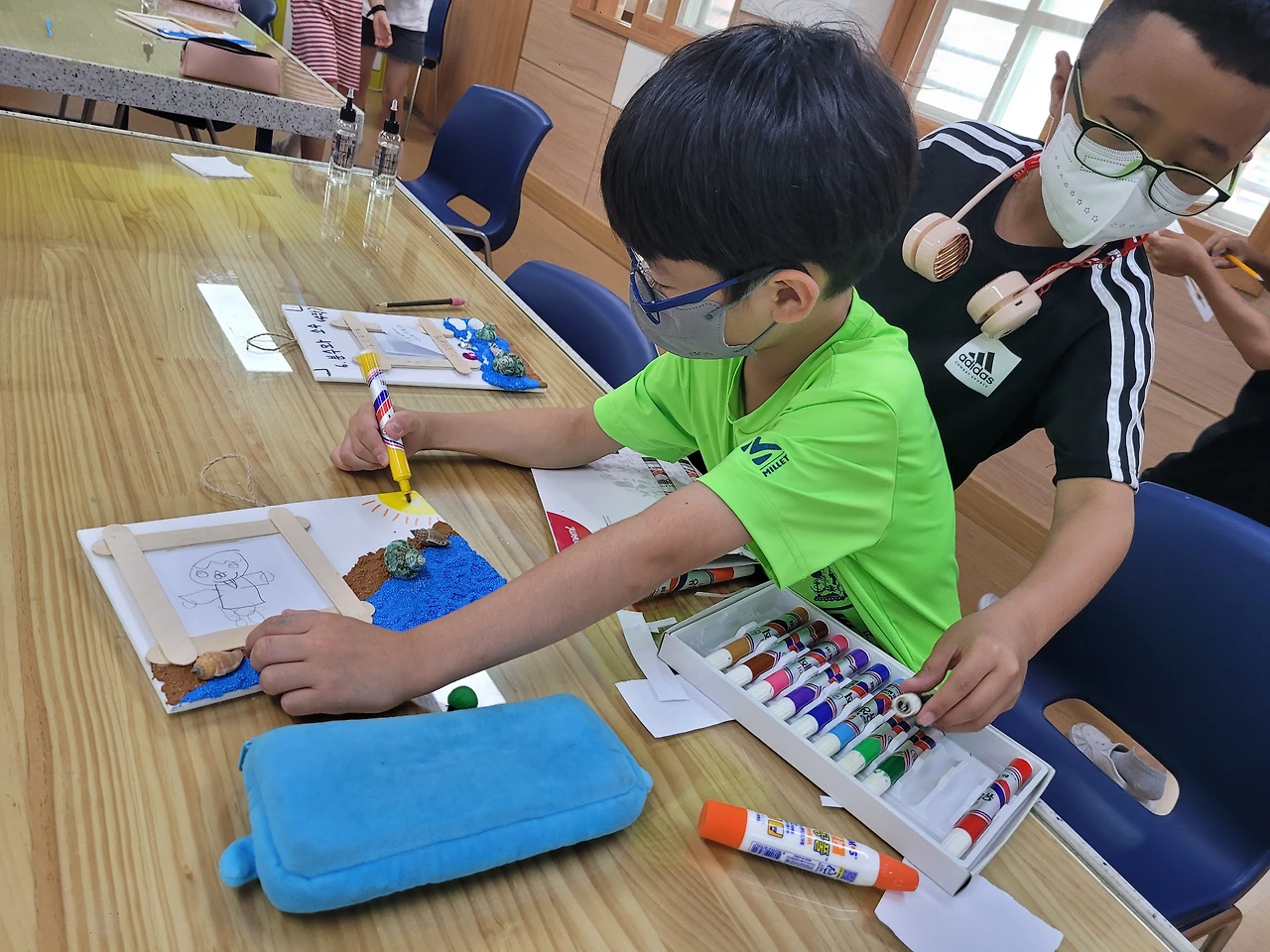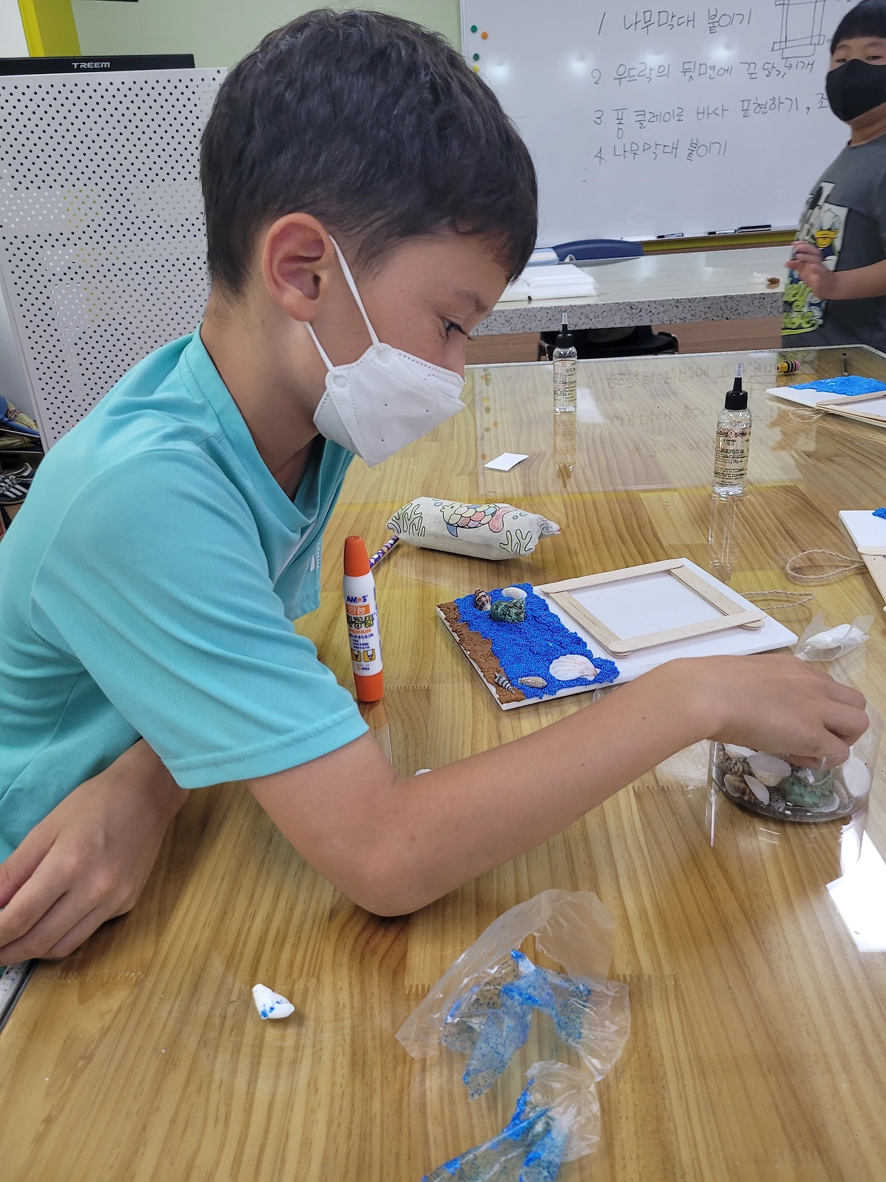 오늘은 지난주에 이어 공예 수업도 했습니다. 아이들이 지난주에 만든 거울과 이번 주에 만든 액자를 집에 가지고 갈 겁니다. 바로 쓰레기통에 들어가지 않도록 잘 관리해주세요!