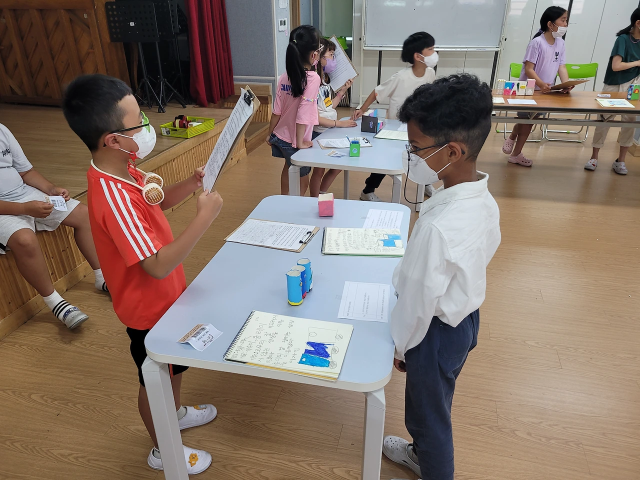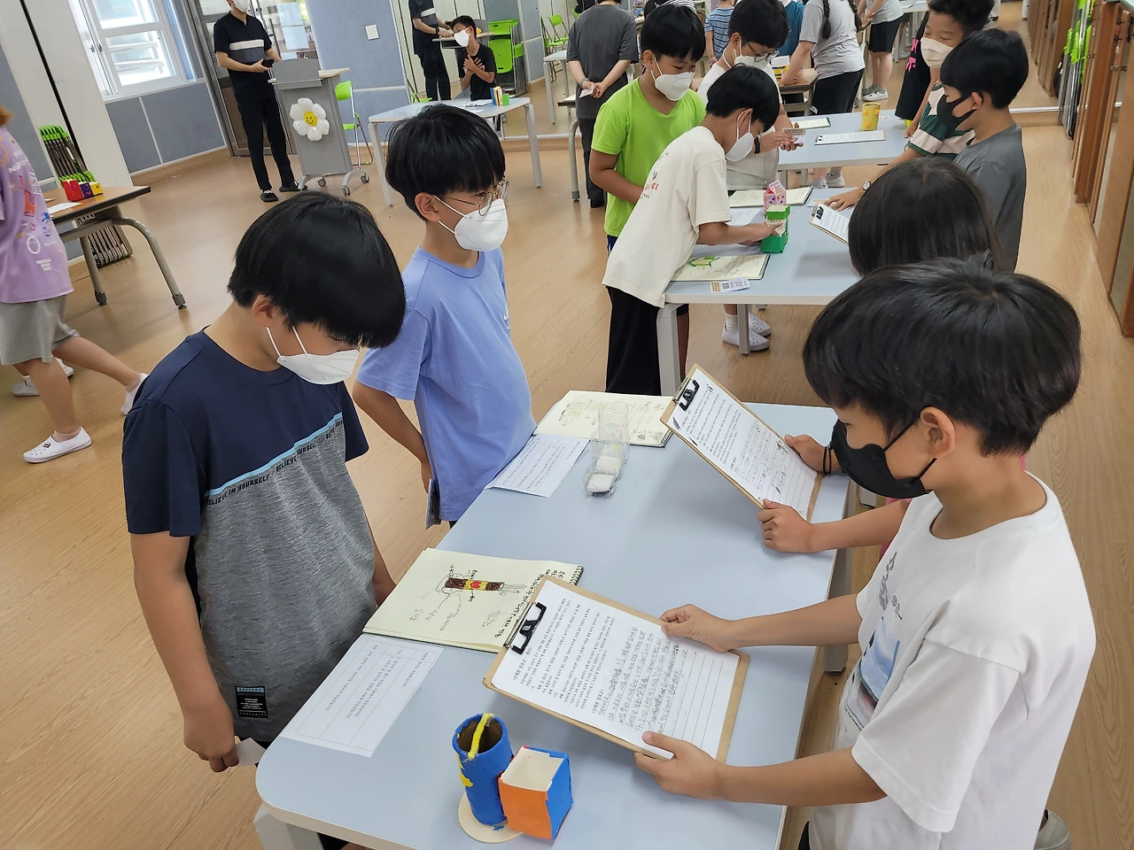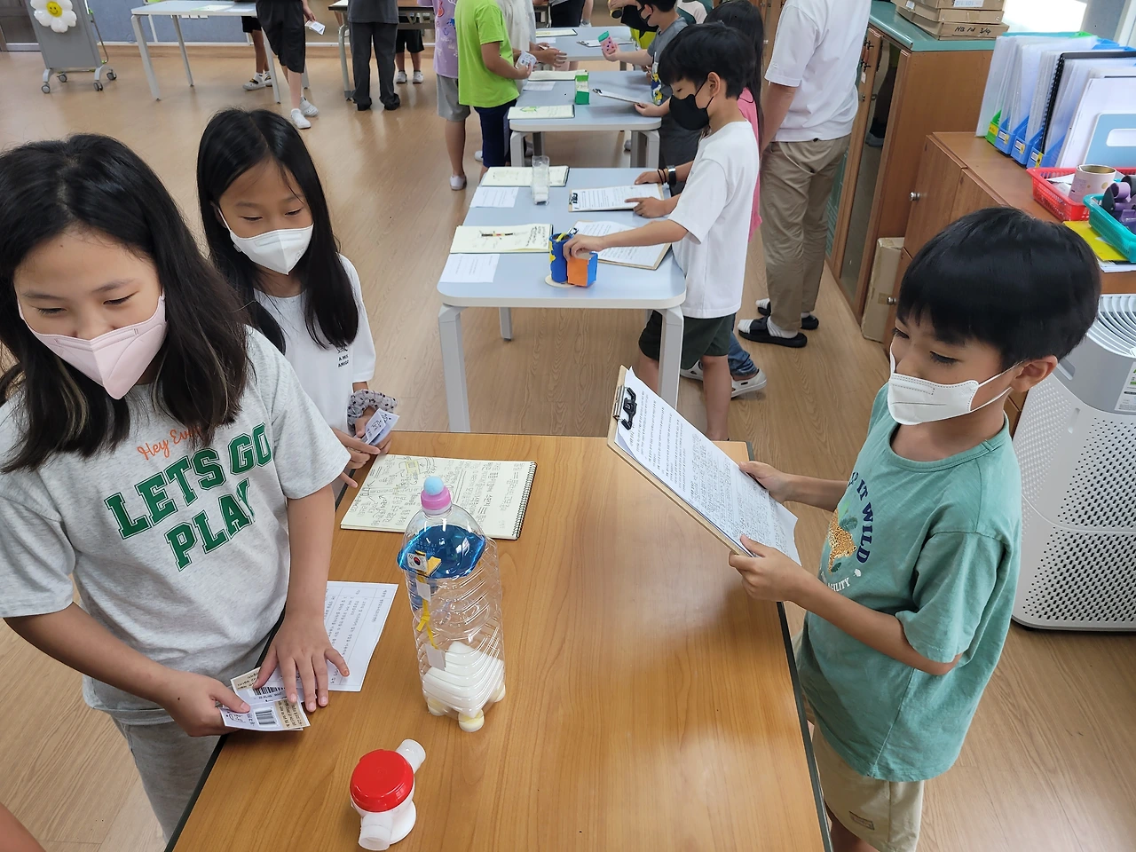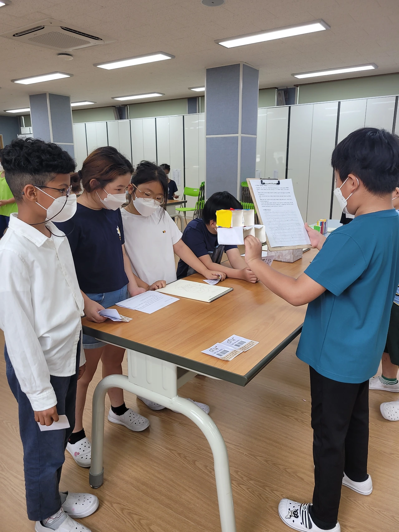 오늘 드디어 최종 활동으로 4학년 학생들을 초청해서 신제품 박람회를 개최 했습니다. 시작하기 전에 아이들의 긴장한 모습이 너무 귀엽고도 대견스러웠습니다.