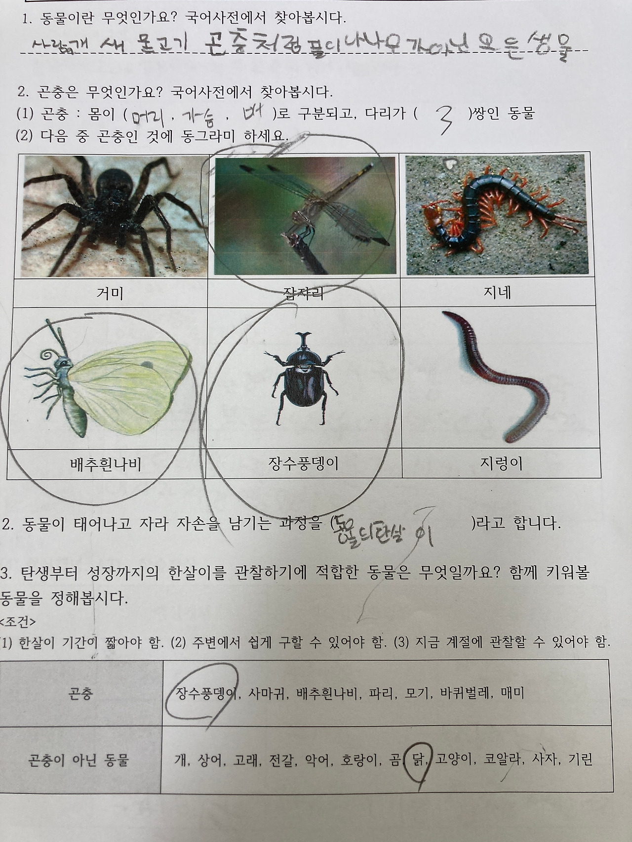 탐구 1의 탐구 질문이 "동물의 뭐고, 성장과정은 어떻게 될까?" 이기 때문에 우선 동물이 뭐고 곤충이 무엇인가 구분하고 알아보았습니다.