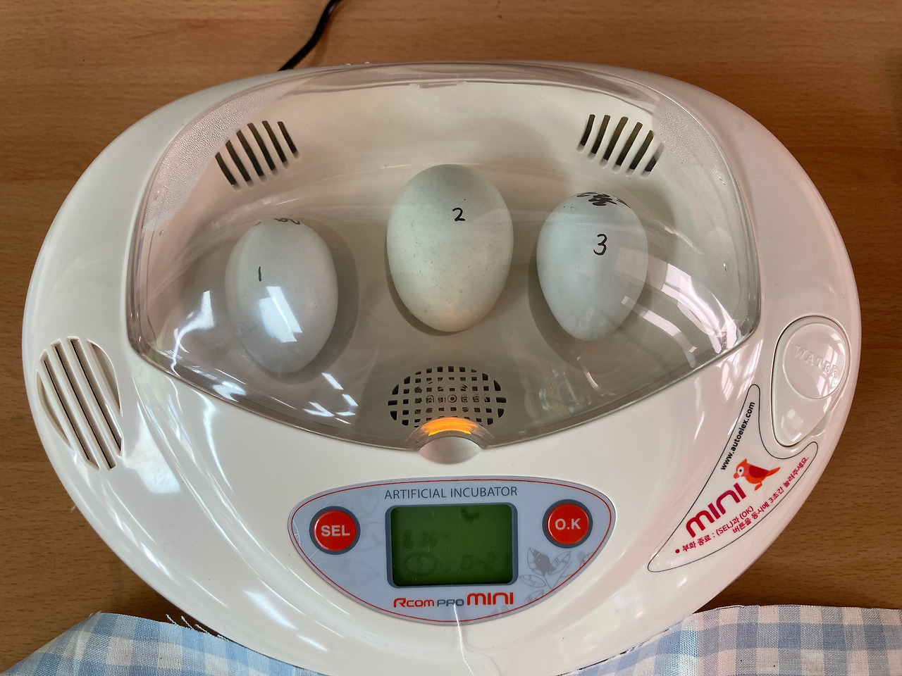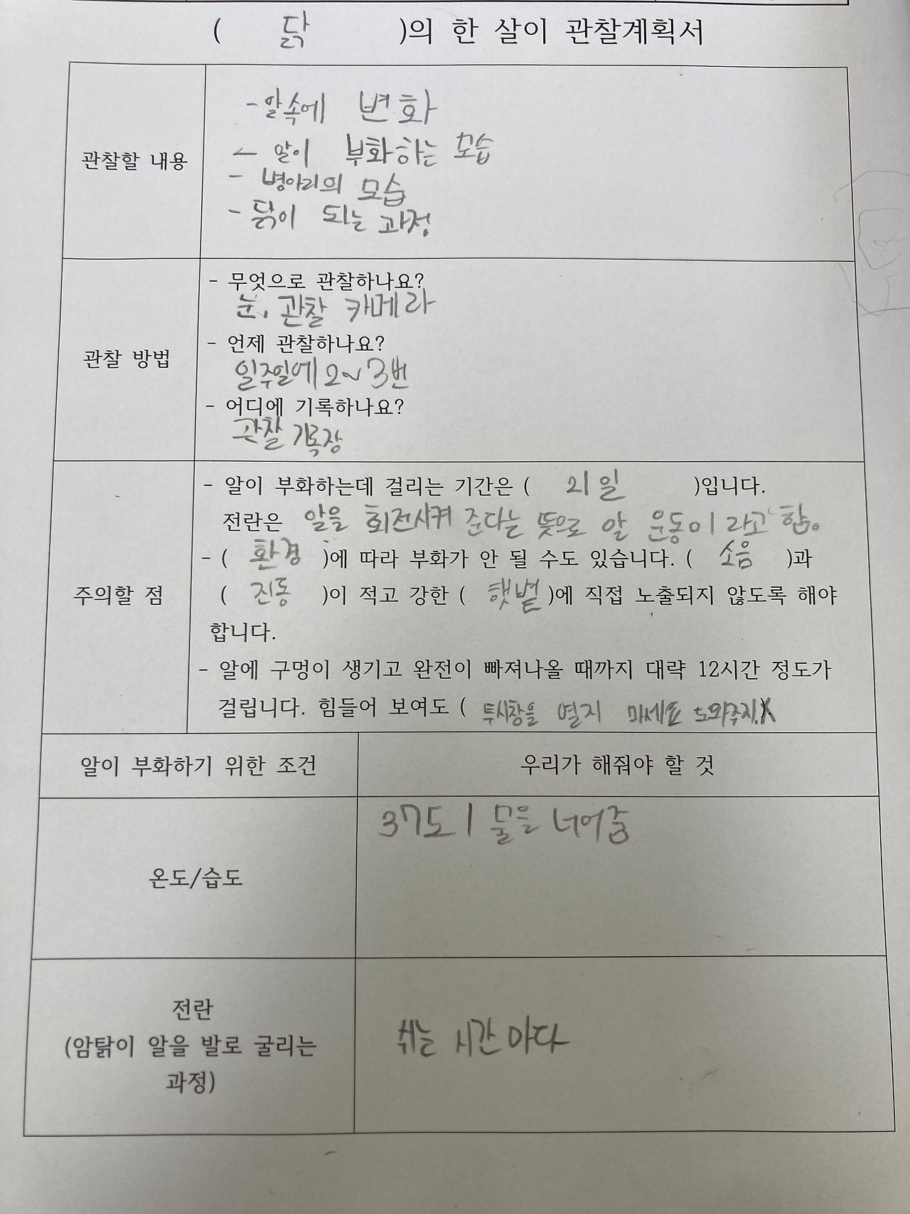 학생들이 학교에 있을 때에는 직접 돌아가면서 전란을 시키기로 해서 전라 기록표도 만들었습니다. 21일 뒤에 3개의 알이 모두 부화하면 좋겠습니다.