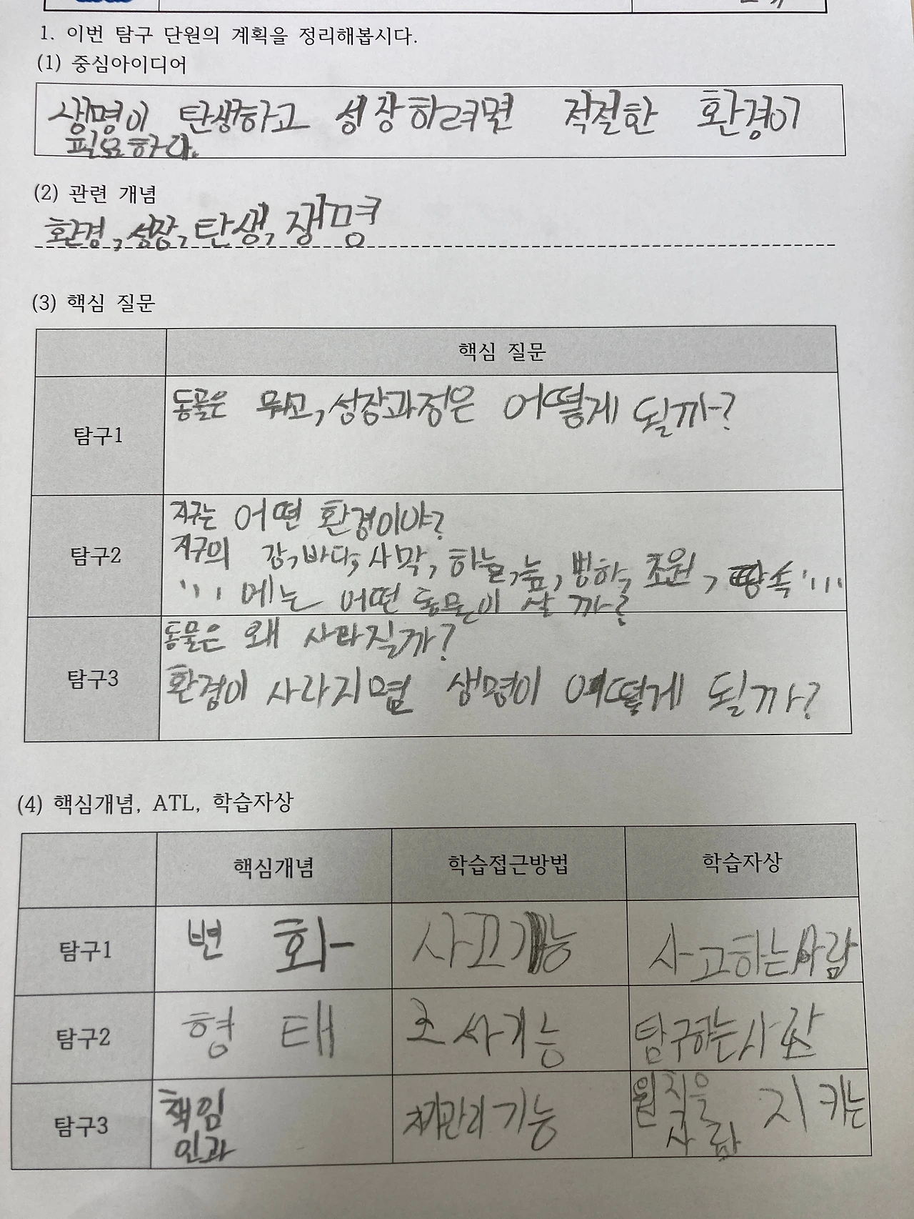 먼저 탐구 시작하기에서 나왔던 중심 아이디어, 핵심 개념, 학습 접근방법들을 정리하고, 탐구 순서에 따라 학생들이 만든 탐구 질문을 정리하는 시간을 가졌습니다.