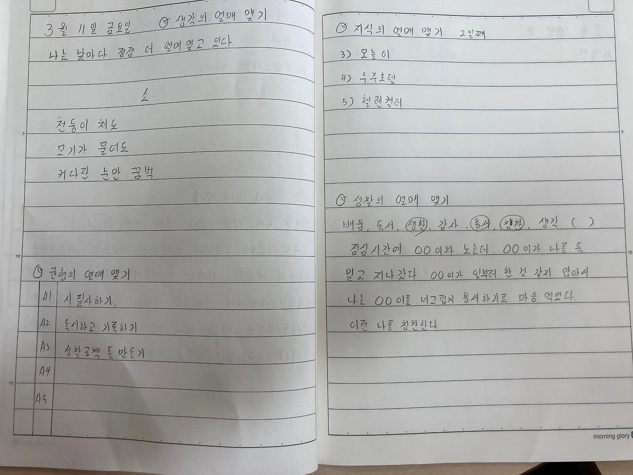 오늘부터 아침 인사를 나누면서 성찰 공책을 확인합니다. 검사가 아니라 확인입니다. 아이들이 쓴 글을 난도질하지 않습니다.