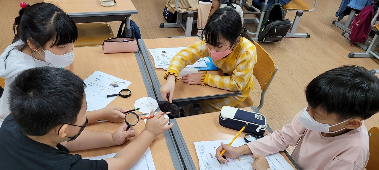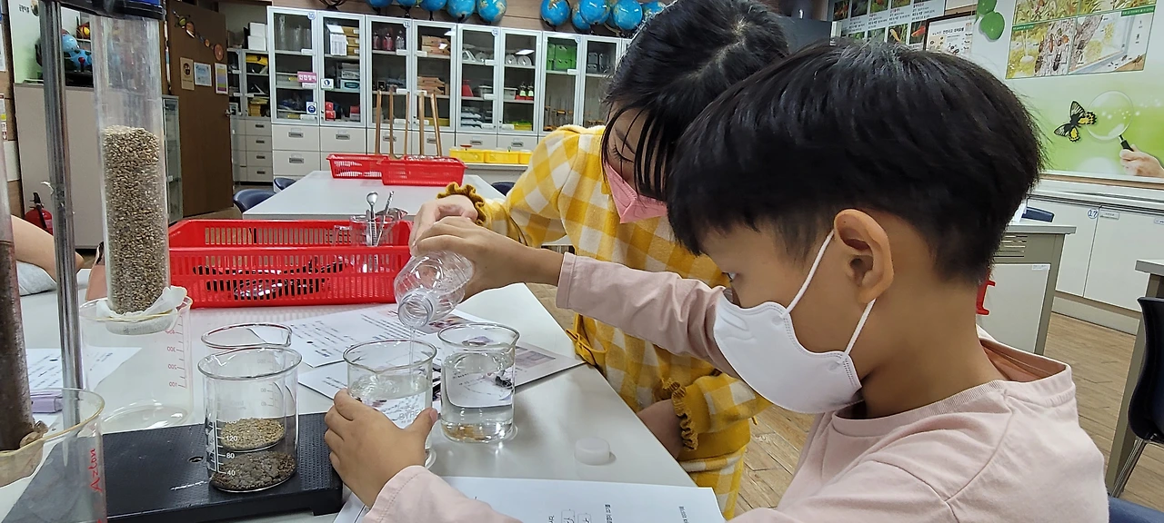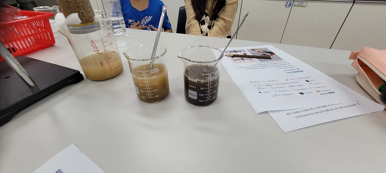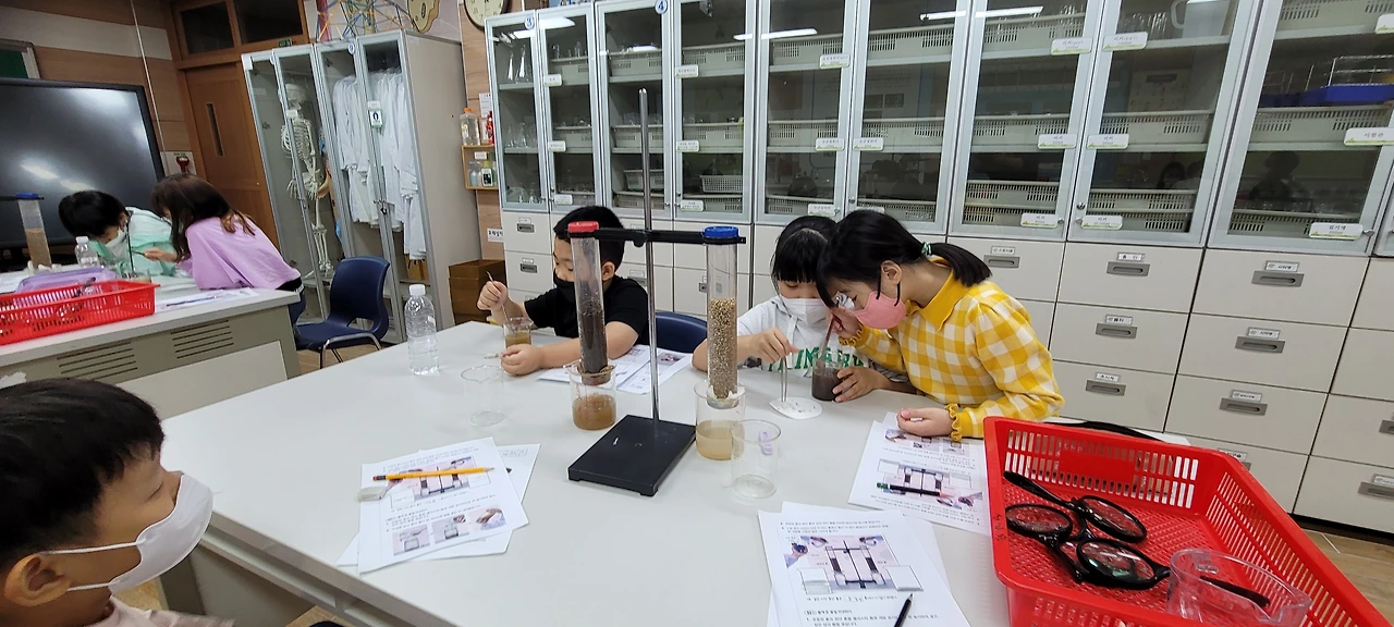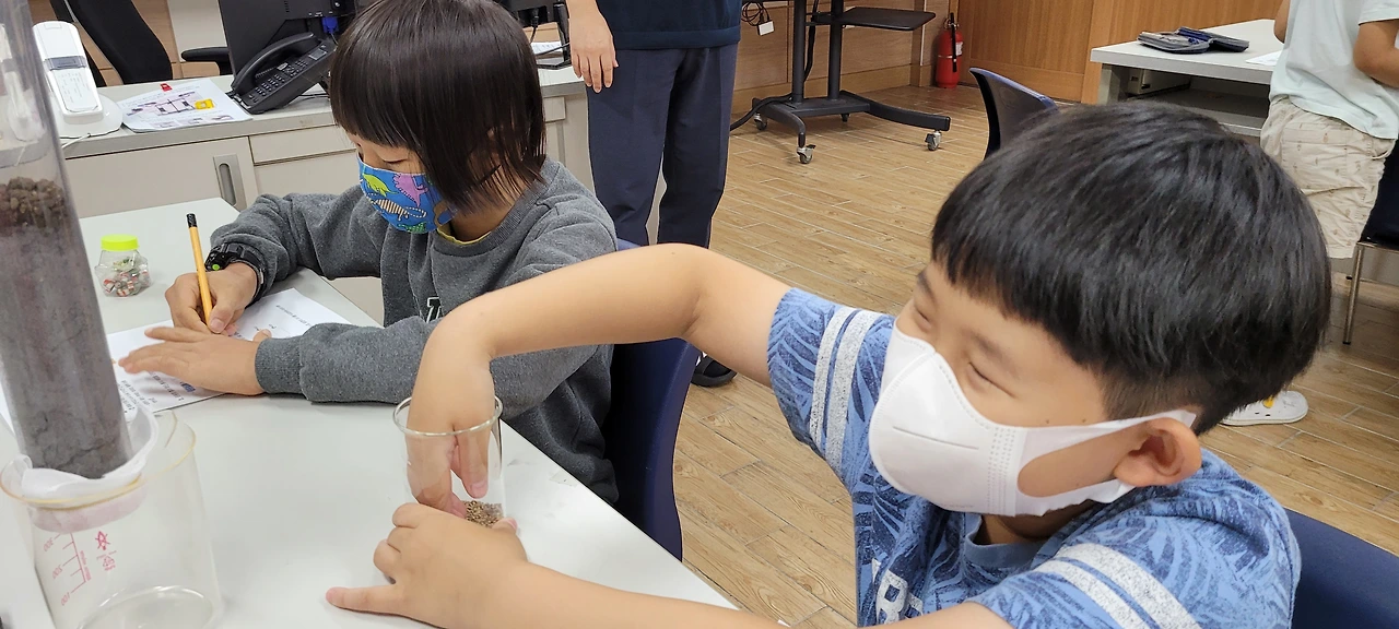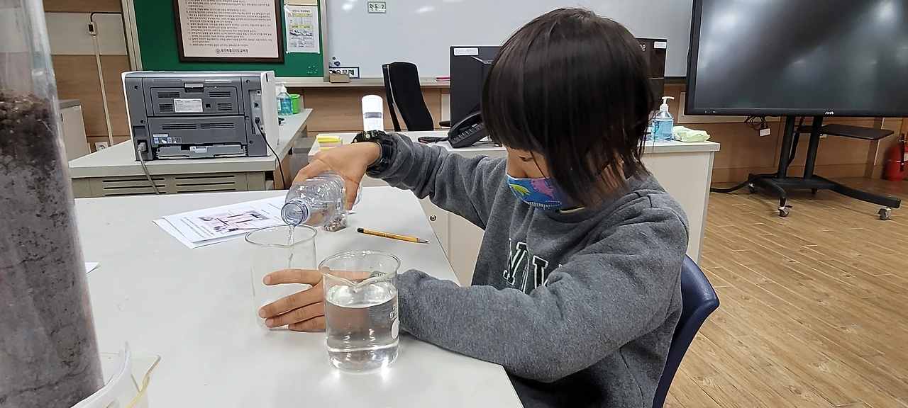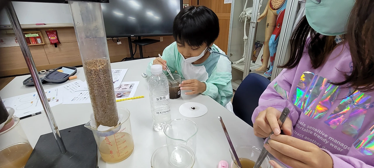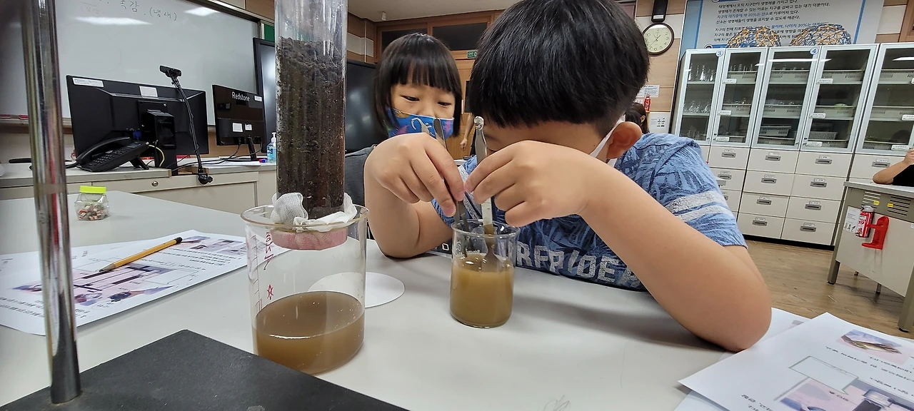 그다음으로는 화단 흙과 운동장 흙에 물을 넣고 저어서 어떤 부유물이 뜨는지를 관찰해 보았습니다. 부유물을 건져내어서, 흰색 종이에 놓고 관찰하고 기록하는 활동을 해보았습니다. 이를 통해 흙의 차이를 알고, 화단 흙이 물을 오래 보관하여 동식물들에게 수분을 공급하고, 각종 이물질들이 동식물의 영양분이 될 수 있음을 직접 체험하게 됩니다.