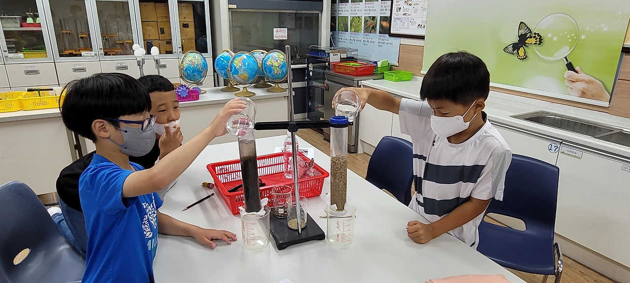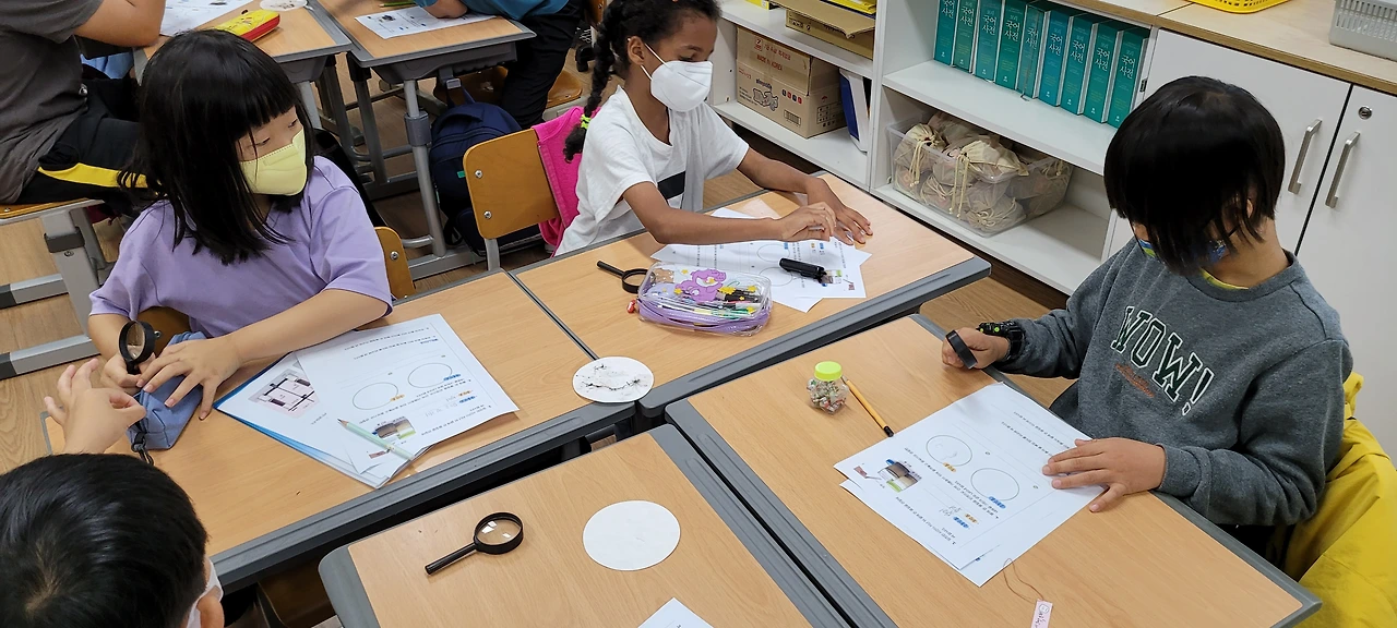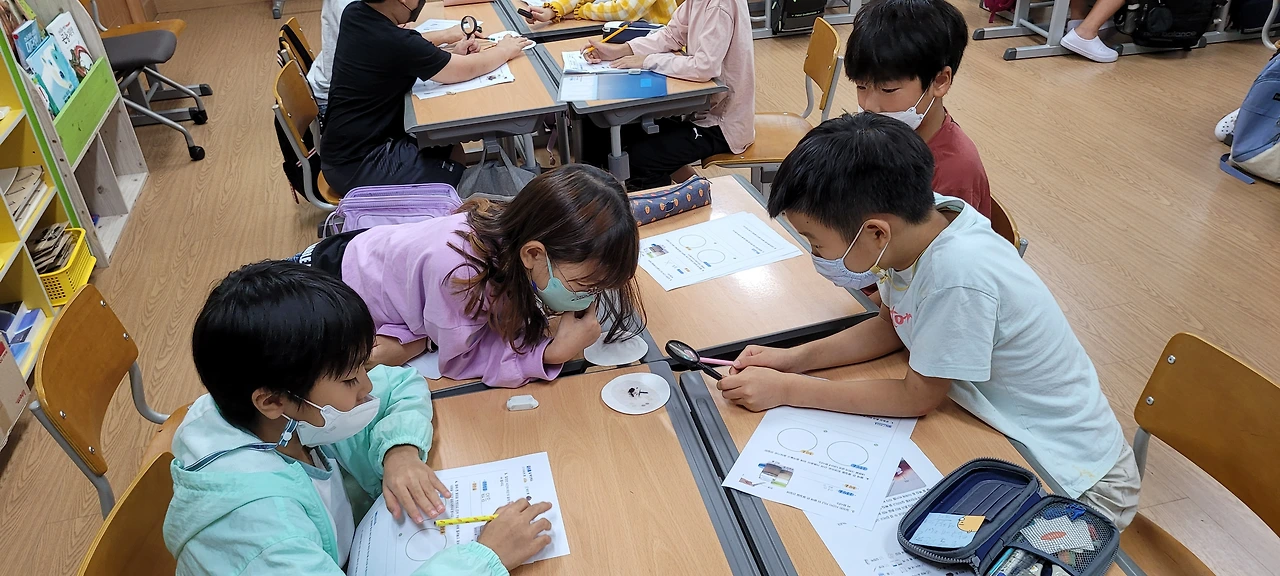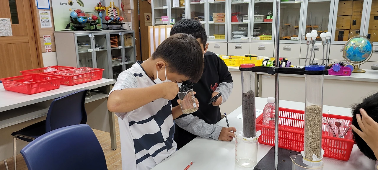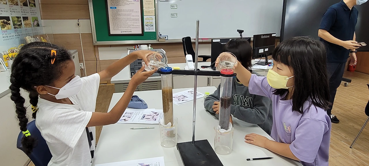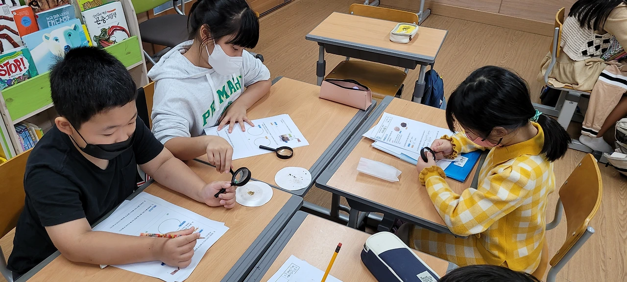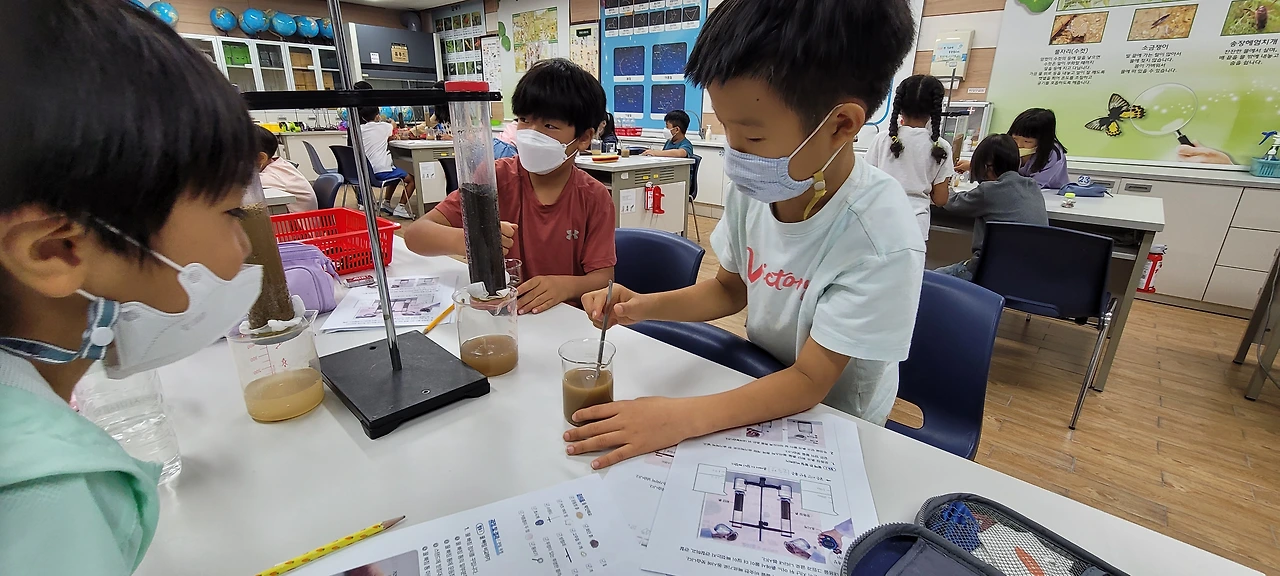 그다음으로는 화단 흙과 운동장 흙에 물을 넣고 저어서 어떤 부유물이 뜨는지를 관찰해 보았습니다. 부유물을 건져내어서, 흰색 종이에 놓고 관찰하고 기록하는 활동을 해보았습니다. 이를 통해 흙의 차이를 알고, 화단 흙이 물을 오래 보관하여 동식물들에게 수분을 공급하고, 각종 이물질들이 동식물의 영양분이 될 수 있음을 직접 체험하게 됩니다.