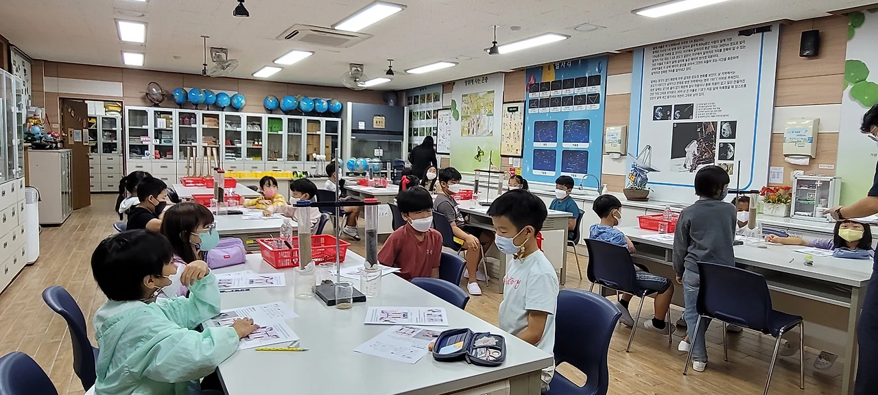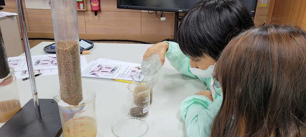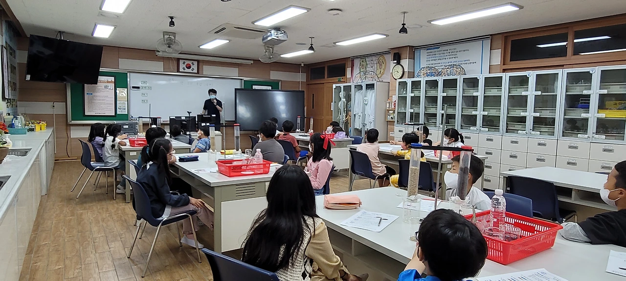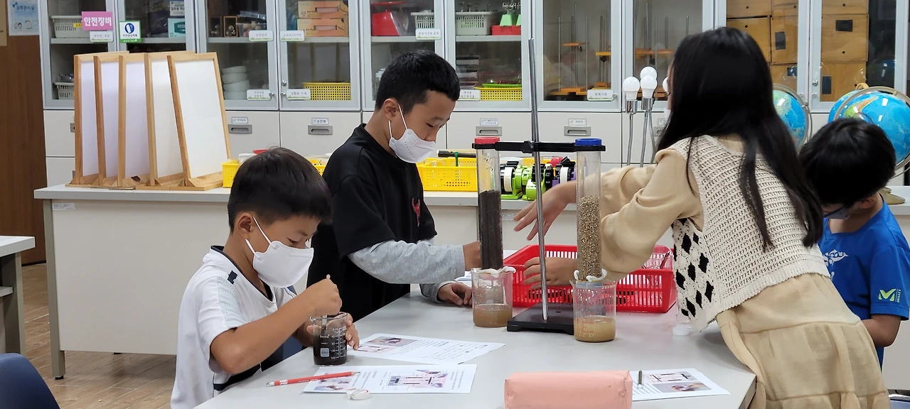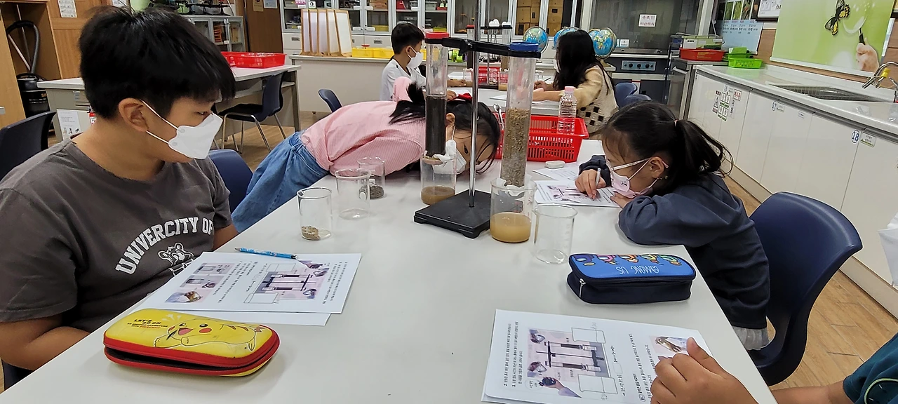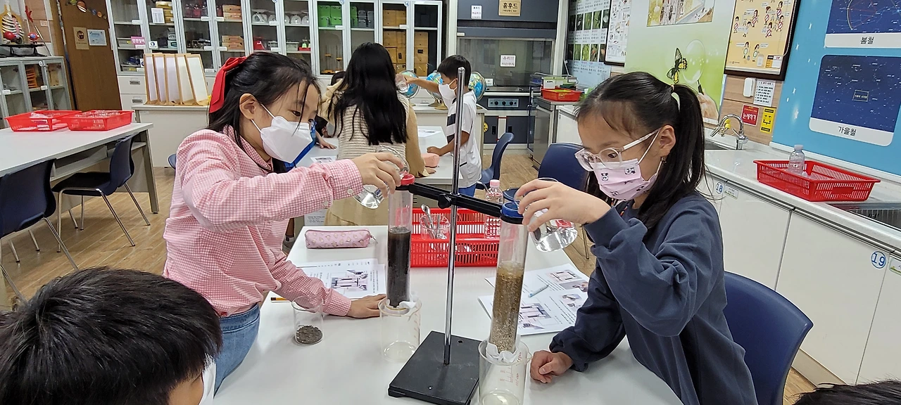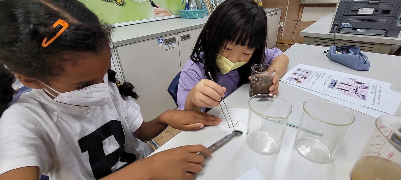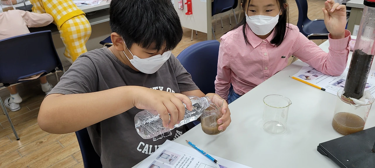 그다음으로는 화단 흙과 운동장 흙에 물을 넣고 저어서 어떤 부유물이 뜨는지를 관찰해 보았습니다. 부유물을 건져내어서, 흰색 종이에 놓고 관찰하고 기록하는 활동을 해보았습니다. 이를 통해 흙의 차이를 알고, 화단 흙이 물을 오래 보관하여 동식물들에게 수분을 공급하고, 각종 이물질들이 동식물의 영양분이 될 수 있음을 직접 체험하게 됩니다.