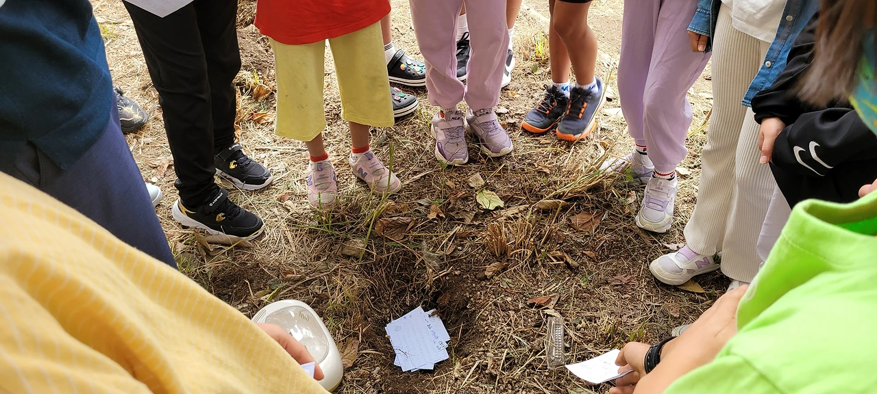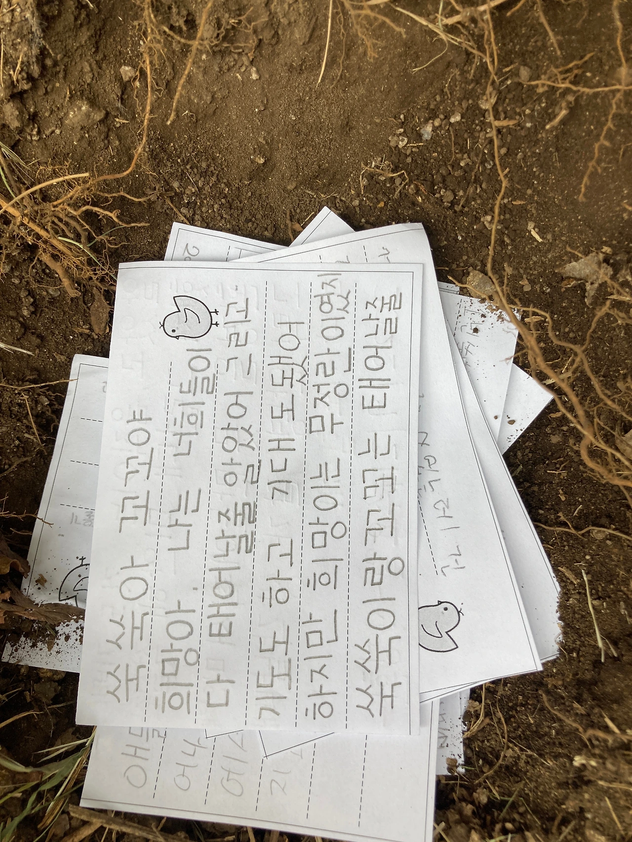 다 같이 나무 아래로 가서 알을 묻어주고, 아이들이 쓴 편지도 함께 묻어 주었습니다.