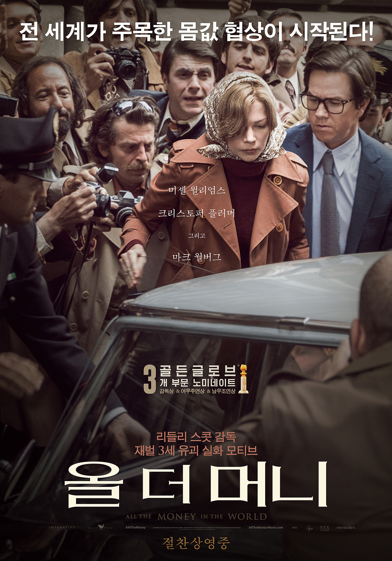 검찰과 문단에서 번지고 있는 미투 운동의 근원지인 미국 영화계에 케빈 스페이시가 성폭력 전력이 드러나 퇴출됐다. 중요한 역할인 폴 게티 역을 맡겨 촬영을 거의 마친 스콧 감독은 과감히 케빈 스페이시 카드를 버렸다. 노장 크리스토퍼 플러머에게 폴 게티 역을 맡겨 9일 만에 다시 찍었다고 한다. 클린턴 대통령도 성추문 후 부적절한 행위였다는 묘한 말로 인정하고 물러나지 않았는데, 대 배우인 케빈 스페이시를 이 영화에서 지워버릴 수 있는 감독의 결단이 당연하면서도 어려웠을 것이다. 결과적으로 폴 케티라는 인물은 크리스토퍼 플러머에게 훨씬 제대로 맞았단 생각이 든다. 이 노장 배우는 1965년 명작 <사운드 오브 뮤직>의 근사한 아버지 게오르그 폰 트랩 대령이었다. 53년이 흘러 <올 더 머니>에서 돈에만 집착하는 실존 인물로 표정과 동작이 더 확실하게 어울렸다. 재촬영으로 다른 배우들도 고생했을 것이다. 유괴된 아들의 엄마 역인 미셸 윌리엄스는 일당 80달러의 형식적인 재촬영 출연료를 선택했고, 유괴범들을 쫓는 마크 월버그는 150만 달러의 재촬영비를 받았다고 한다. 마크 월버그는 문제가 되자 15억 전액을 성추행 여성 지원단체인 타임스 업에 기부했다. 두 배우의 출연료 차이가 성별 임금 격차와 불평등 문제로 떠오른 모양이다. 거장이 만든 돈 영화에 성추문 재촬영과 배우들의 출연료 문제로 시끄러웠다는 것은 미국도 한국과 마찬가지로 도덕성, 돈 문제가 부글부글하다는 방증인 것 같다.