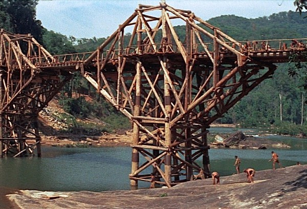 내가 감상하기 시작한 부분은 연합군이 특공대를 조직해 콰이강 다리 폭파 임무를 띠고 태국 밀림에 투입되는 장면부터다. 낙하산 투하로 1명이 사망하고, 태국 여자들을 짐꾼으로 동원해 거머리가 득실거리고 길이 없는 정글의 수풀을 헤치고 목적지로 향한다.