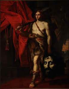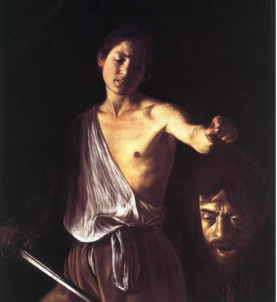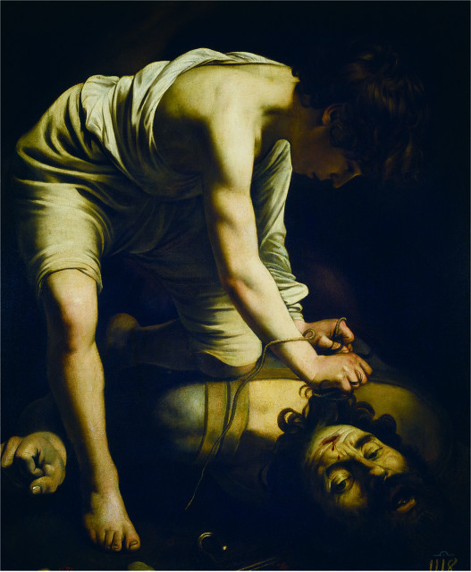 바닥에 납작 드러누운 채 쏟아지는 빛에 눈을 감고 앞으로 펼쳐질 사도로서의 시작을 보여주는 듯한 바울(바울의 회심), 무겁게 늘어져 핏기 없는 예수의 시신을 차갑게 훑는 달빛(그리스도의 매장), 성모 신앙을 중시하는 수도회의 주문으로 그렸지만 세간에 큰 충격을 안긴, 신성함은 없고 죽음만 있는 성모(성모의 죽음), 부활해서 오신 예수 앞에 그 어떤 외경심도 표현하지 않은 채 제자들의 호기심만 드러낸 도마(의심하는 도마), 술집에서 돈을 숨기기에 급급한 마태에게 쏟아지는 빛의 부르심(마태를 부르심) 등. 그는 자신이 검증하고 해석한 표현을 거침없이 옮겼다. 살인죄로 고통하며 어둠 가운데 있던 그에게 빛이 내리기를 간절히 원한 것일까. 사람과의 교감에 실패하고 자기 속에 유폐된 채 살던 카라바조 내면이 그의 그림에 담겨 있다고 볼 수 있다. 이런 카라바조의 작품에 등장한 내면의 갈등의 정점이 다윗과 골리앗 그림이 아닐까 한다. 이 그림이 우리에게 남긴 메시지가 강렬하다.