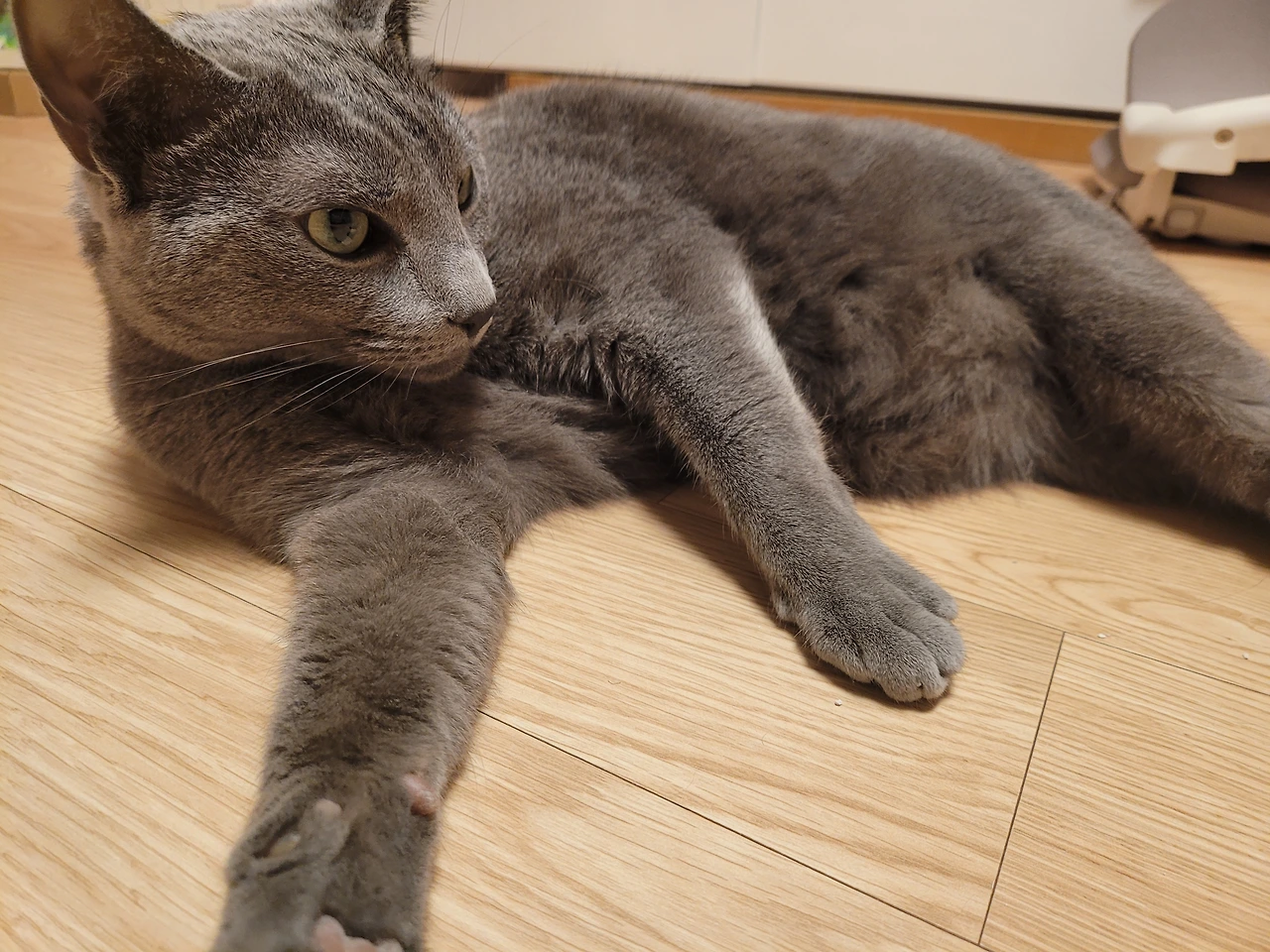 가끔 집사는 영희를 끌어안고 말랑말랑한 배를 원 없이 만진다. 아, 행복하다. 평소엔 무음냥이지만, 이때만은 아아아아앙 하면서 불만을 드러낸다. 그 소리가 귀여워서 더 만지고 싶다. 잽싸게 집사 품에서 도망간 영희는 또 열심히 앉아서 그루밍 중이다.