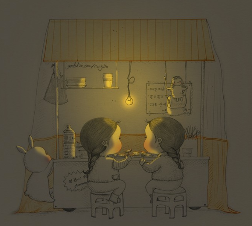 흰 눈이 소복소복 내리던 그 겨울, 너와 나는 떡볶이가 먹고 싶어 무작정 나가 눈을 맞으며 김이 모락모락 나는 떡볶이를 긴 꼬챙이에 꽂아서 후후 불어 너 한번 나 한번 먹었지, 떡볶이 위로 눈이 사르르 녹는 것을 보고 우리는 눈꽃 떡볶이를 먹는다며 까르르 좋아했어. 그 장면은 어느 기억보다 생생하게 사진 찍혀 머릿속 행복 사진첩에 잘 간직하고 있단다.