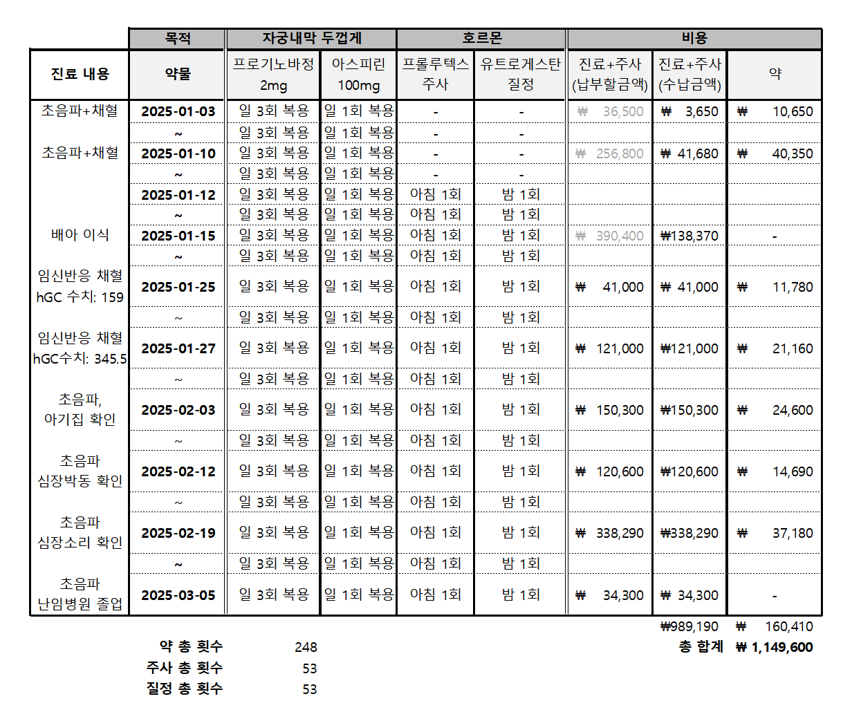 계산을 해보니 작년 2월에 처음 난임 병원에 방문한 이후, 약 1년이라는 시간과 약 300만 원이라는 비용이 들었다. (가임력 검사와, 자궁 용종 제거, 세 번의 인공수정 시술 포함. 시험관 시술을 하는 동안의 진료 및 처방 기록과 비용 내역은 아래의 표에 정리해 두었다.) 시험관 시술 과정에서 난자를 2개밖에 채취하지 못해서 절망했지만, 생각해 보면 덕분에 난자 채취 후 배가 거의 아프지 않았고, 배아 개수가 적어서 배아 동결 비용도 최소한으로 들었으며, 기대를 내려놓을 수 있어서 오히려 편한 마음을 가질 수 있었다. 그 편안한 마음이 아기와 닿을 수 있도록 다리를 놓아준 게 아닐까.