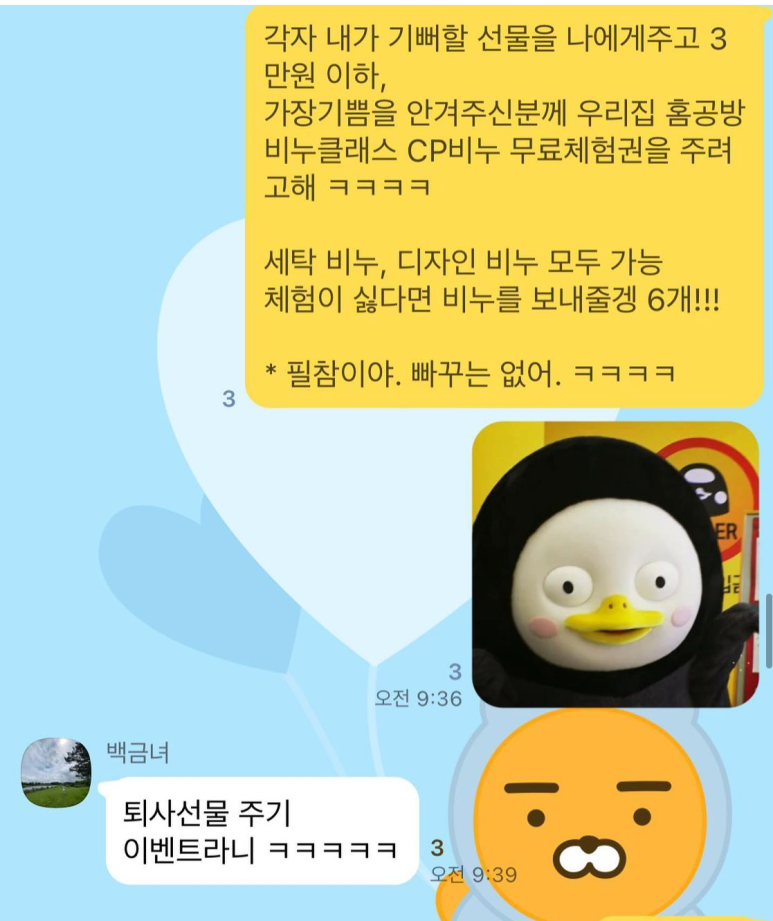 퇴사선물 이벤트를 걸었을때 돌아온 다양하고 재미난 반응들. (막상 말할사람이 없어서 너무 심심해서 그래. 너네도 퇴사해봐) 퇴사 축하한다며 다들 부러워하면서 선물준거 너무 웃김. 이벤트야 얘들아. 재밌지?