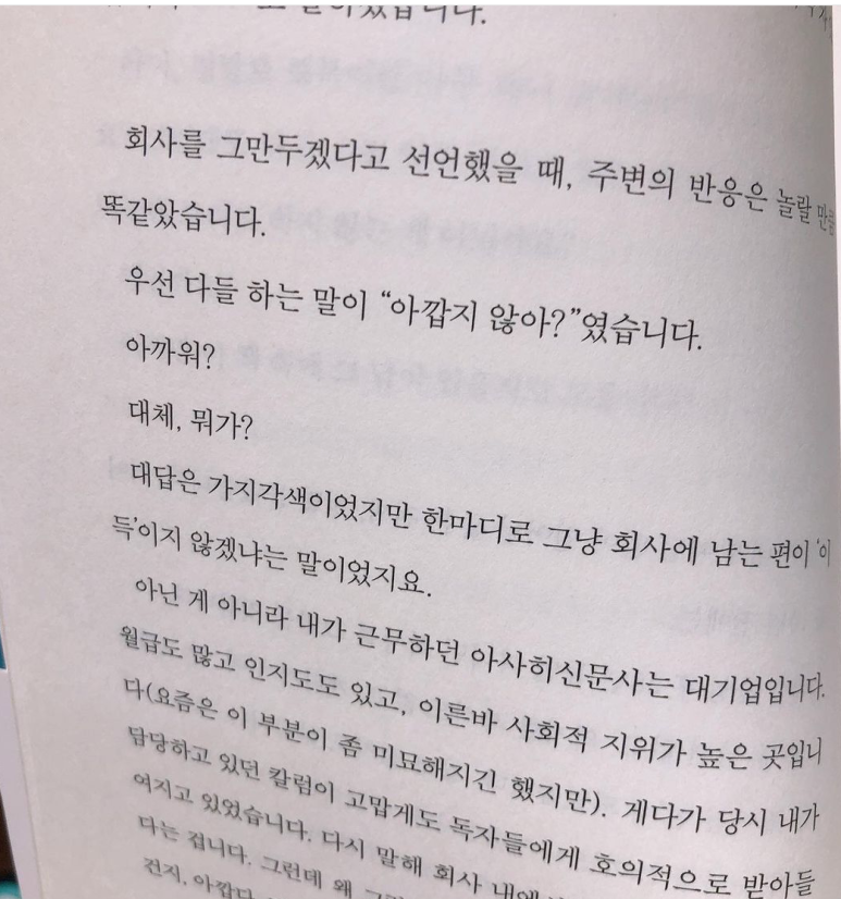 퇴사를 한다고 했을 때 새로운 출발을 응원하고 부럽다고 축하하는 사람들 반. 밖은 춥다며 다들 "아깝지 않냐?"는 반응이 반이었다. 아니에요. 지금 마음 뜬 회사에 다니는게 그게 더 시간이 아까운 거에요. 그랬어요. (결혼안하고, 처자식 없을때 가능. 서두르세요)