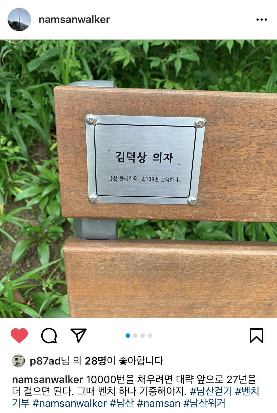 남산에 가면 남산 둘레길을 2,139번 산책한 김덕상님의 의자가 있는데. 상무님 소원도 계속 걷고 또 걸어서 27년 정도를 걸어 만번을 채우게 되면 남산에 벤치 하나 기증 하고싶다고 하신다. 정말로 벤치 기부하시는 것 꼭 보고싶다. 격하게 응원합니다.