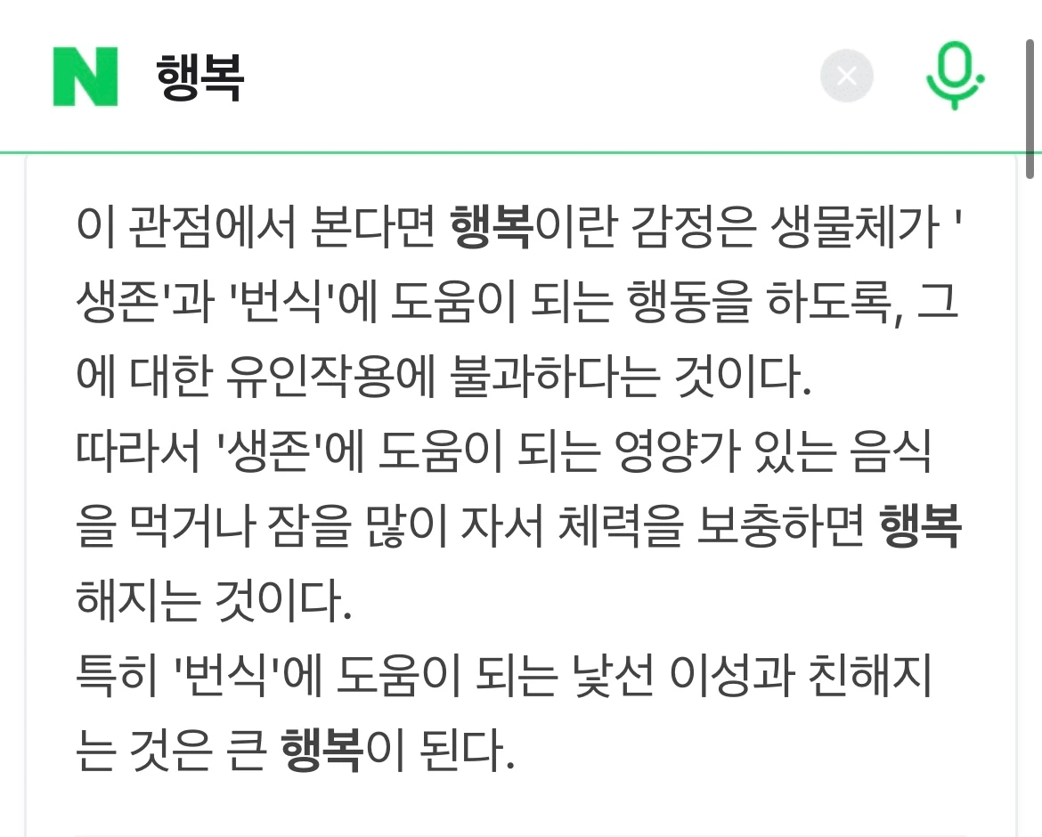 행복이라는 것이 생존과 번식에 도움이 되는 행동을 하도록 그에 대한 유인작용에 불과하다니?