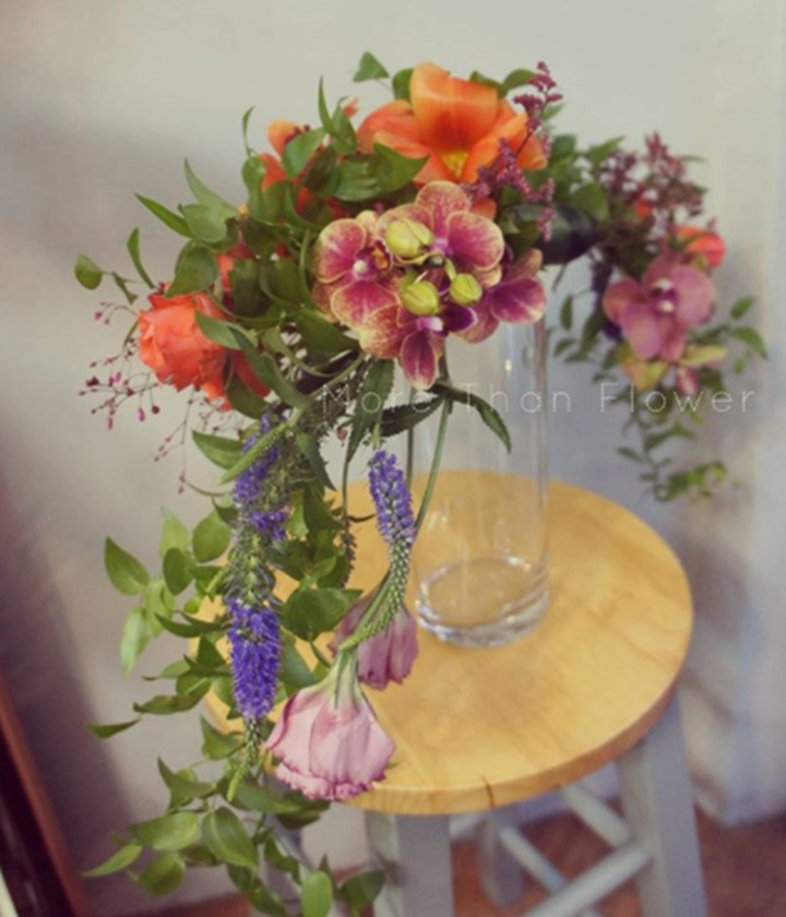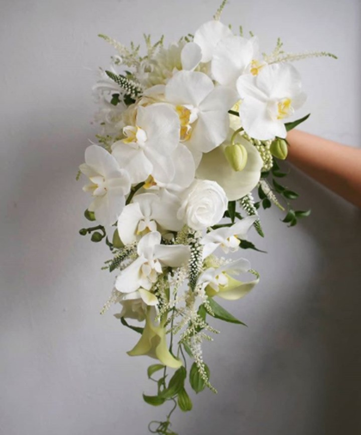 교회, 성당의 종교예식 그리고 교회 느낌으로 꾸며 놓은 채플 예식은 경건하고 따뜻한 느낌의 결혼식이 많다. 차분하고 깔끔한 결혼식을 선호하는 신랑 신부의 웨딩홀 만족도 1순위는 단연 채플 웨딩홀이다. 이러한 정적인 결혼식장에는 케스케이드형 부케가 잘 어울린다. 자연스럽게 떨어지는 케스케이드형 부케는 채플 웨딩 특유의 경건한 느낌을 더욱 세련되게 표현해 줄 수 있을 것이다.