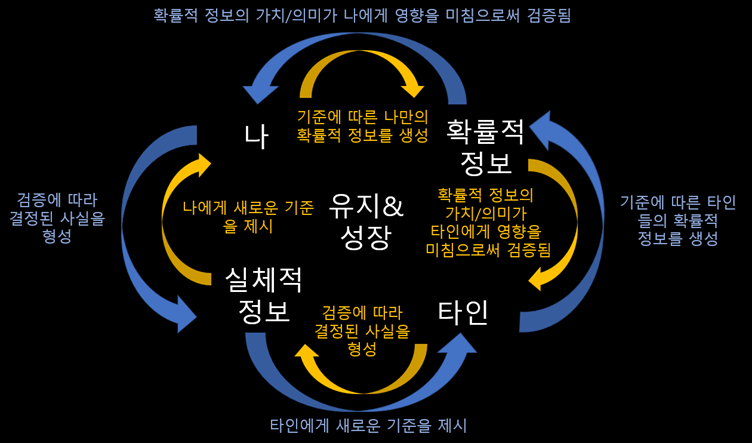 이렇게 타인과 내가 납득한 목표를 향해 ‘하나’로 정보를 순환시키면서 최대한 많은 실체적 사실과 확률적 정보들이 서로를 검증하고 생성하는 상호보완적인 관계를 믿음으로 유지하여 같이 성장하는 것입니다. 목표를 잡고 이루는 과정에서 타인과 신뢰할 수 있는 정보를 평등하게 공유하고, 정보에 대해 자유롭게 다양한 의견을 제시하고, 이 의견이 민주적 절차로서 존중될 수 있어야 하는 것입니다. 이러한 ‘하나’에서만이 순환에 따라 자신의 삶이 유지/성장할 수 있다는 믿음이 유지/성장함으로써 존재할 수 있기 때문입니다. 만약 목표가 좋다고 한들 ‘하나’가 순환하지 않는다면 타인과의 불신과 오해로 인해 일상과 삶의 근본적인 동력을 잃게 되어 목표를 이루는 과정에서 직면하게 되는 다양한 문제에 흔들리게 되고 점점 약해지다가 결국 분열되는 것입니다. 이는 자신의 생각과 결정을 온전히 이루기 위해서는(=삶이 존재하기 위해서는) 타인과 지속적이고 평등한 정보 공유와 이를 기반하는 소통이 필수적인 것임을 의미합니다. 즉, 지금의 ‘나’(나의 삶)를 알아간다는 것은 타인을 평등하게 받아들이는 것을 기반으로 서로 투명한(믿을 수 있는) 정보(과거, 현재, 미래(삶)에 대한 객관적인 사실과 솔직한 생각)를 공유하고 소통하면서 믿음을 형성하고 서로를 납득시킬 수 있을 때 가능한 것입니다. 바로 이것이 우주와 자연의 객관적인 사실들이 증명하는, 확률적 존재(시공간)와 실체적 존재(시공간)가 순환을 이루고 있는 삶의 형태와 움직임인 것입니다.