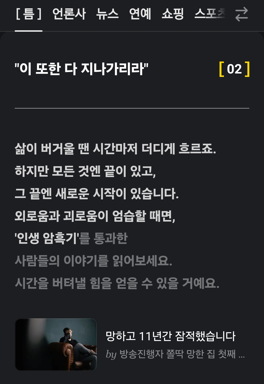 저의 시련수기가 인생 암흑기를 통과하고 계신 많은 분들께 조금이라도 힘이 되었으면 좋겠다는 희망을 갖게 되었습니다.