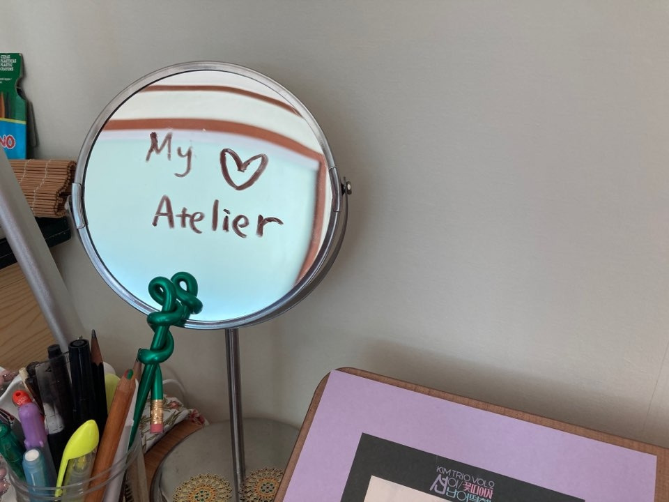 집안에서 내 취향인 물건들을 모아 작업대에 신중하게 올려두는 과정이, 그려뒀던 그림을 하나하나 벽에 붙여 놓는 일들이 너무 벅찼다. 마지막에 작은 거울 위에 립스틱으로 'My Atelier'라고 쓰면서 내가 어떻게 이런 발상을 한 것인지 나 자신이 너무 좋아 꼭 껴안아주고 싶었다. (자기애 대폭발!)
