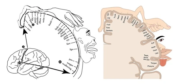 캐나다의 신경외과의사인 와일더 펜필드는 인간의 대뇌피질, 좀 더 명확히는 뇌의 중심고랑 뒤쪽 표면에 인간의 감각신경과 운동신경이 각기 다른 신체부위에 얼마만큼 연관되어 있는지 연구하여 위와 같은 모델을 만들었다. 이것을 펜필드 호문쿨루스(Homunculus of Penfield)라고 한다.