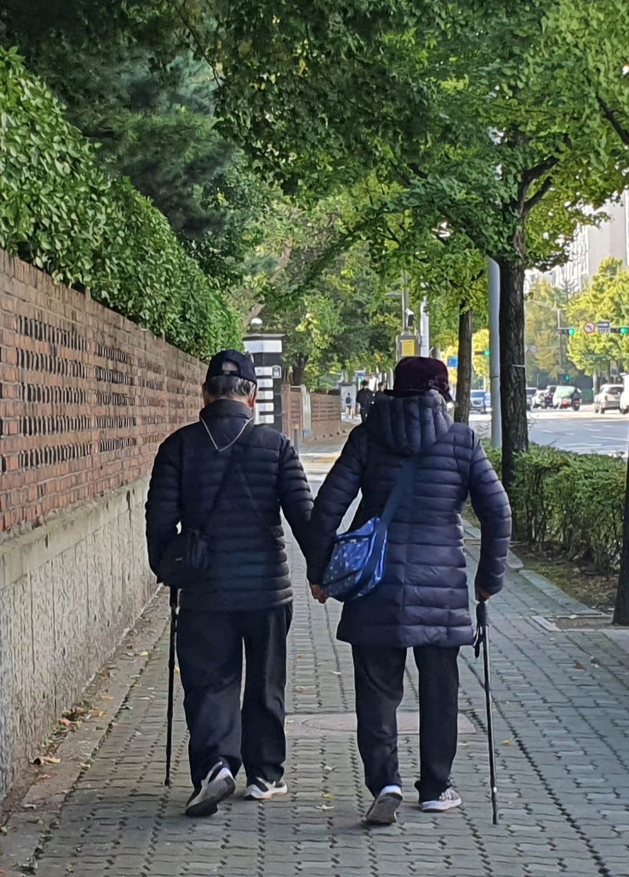 낮에는 걷기 운동을 하려고 따뜻하게 입고 한 발 한 발 천천히 걸어서 집 밖으로 나갔다. 어차피 빨리 걸을 수도 없었다. 그나마도 오래 걸을 수 없어서 곧 벤치에 앉아서 쉬어야 했다. 갑자기 팍 늙어버린 기분이었다. 벤치에 앉아서 사람들을 보고 주변 풍경을 보면서 마음이 여유롭기보다는 쓸쓸해졌다. 돌아오는 길에 젊은 여성 두 명이 자녀 학원 얘기를 하면서 지나치는데 낯설게 느껴졌다. 반면 걸음이 불편한 사람들은 눈에 더 많이 띄었다. 그중에서도 내 앞에서 느리게 함께 걷고 있는 노부부가 서로 손을 꼭 잡고 있는 모습이 정말 인상적이었다. 함께, 느리게 걸을 사람이 있다는 것이 얼마나 큰 위안이 되어 줄까?