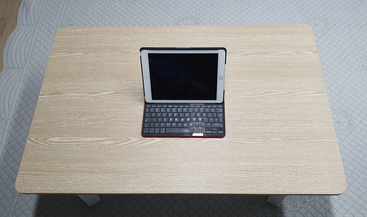 얼핏 보면 원목 탁자 같아 보이는 좌식밥상과 내 글쓰기 도구이자 아이의 게임기로 열일하는 7년된 아이패드