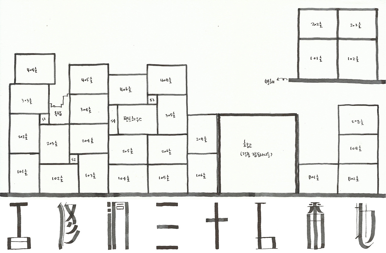 2007년 준공된 건물은 컨테이너를 이리저리 쌓아 놓은 것처럼 규칙적이고, 불규칙적으로 조성되었다. 2013년 부지를 옮겨 다시 지어졌는데, ‘상자’라는 특이성 덕분에 규칙과 불규칙이 손바닥 뒤집듯 뒤집혔어도 이내 자리를 잡았다. 건물을 구성하고 있는 각각의 ‘상자’들은 고작 15mm MDF 합판으로만 지어졌다. 건물은 햇빛에 바래 군데군데 제 색깔을 잃어버린 곳이 있다. 몇 번의 장마를 거치면서 조금씩 뒤틀려 부분 부분 아귀가 맞지 않는 곳도 있다. 몇몇 악조건 속에서도 주민들은 지금껏 불평불만이 없다. 자신들이 머물고 있는 건물에 관심 두지 않았다. 주민들은 이따금씩 강제 이주를 당했다. 가족이지만 헤어져야 했고 사랑하지만 이별해야 했다. 그래도 주민들은 불평불만이 없었다. 자신들의 이별을 슬퍼하지 않았다. 그들은 그저 가만히 있었다. 그렇다고 그들이 아무것도 하지 않는 것은 아니었다. 그들은 기다리고 있었다. 무엇을 기다려 왔고, 기다리고 있는지 알 수 없지만 그들이 기다리고 있다는 것은 분명하다. 그렇지 않고서야 이렇게나 가만히 있을 수 있을까. 주민들이 ‘가만히 있다’는 것 때문에 겉보기에는 아무 이야기도 없어 보이지만 그들에게는 나름의 사연이 있다. 주민들의 건물이 상기시키고 있는 ‘이야깃거리’를 제외하고도 충분히 들여다볼만한, 들여다보고 싶은 각자의 이야기가 있다. 그러니까,